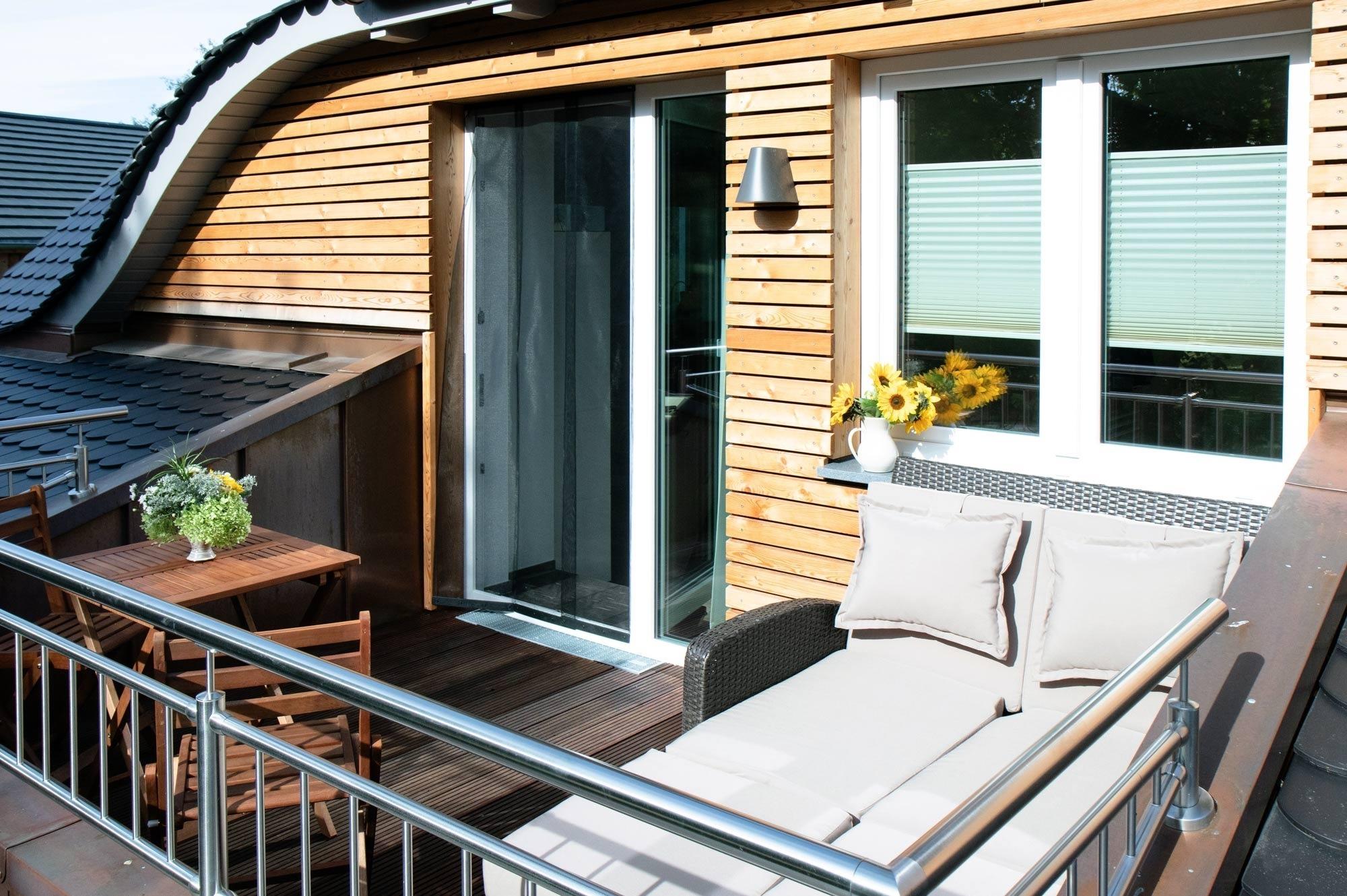 Balkon: Südbalkon mit gemütlichen Loungemöbeln und Sonnenschirm, ideal zum Entspannen