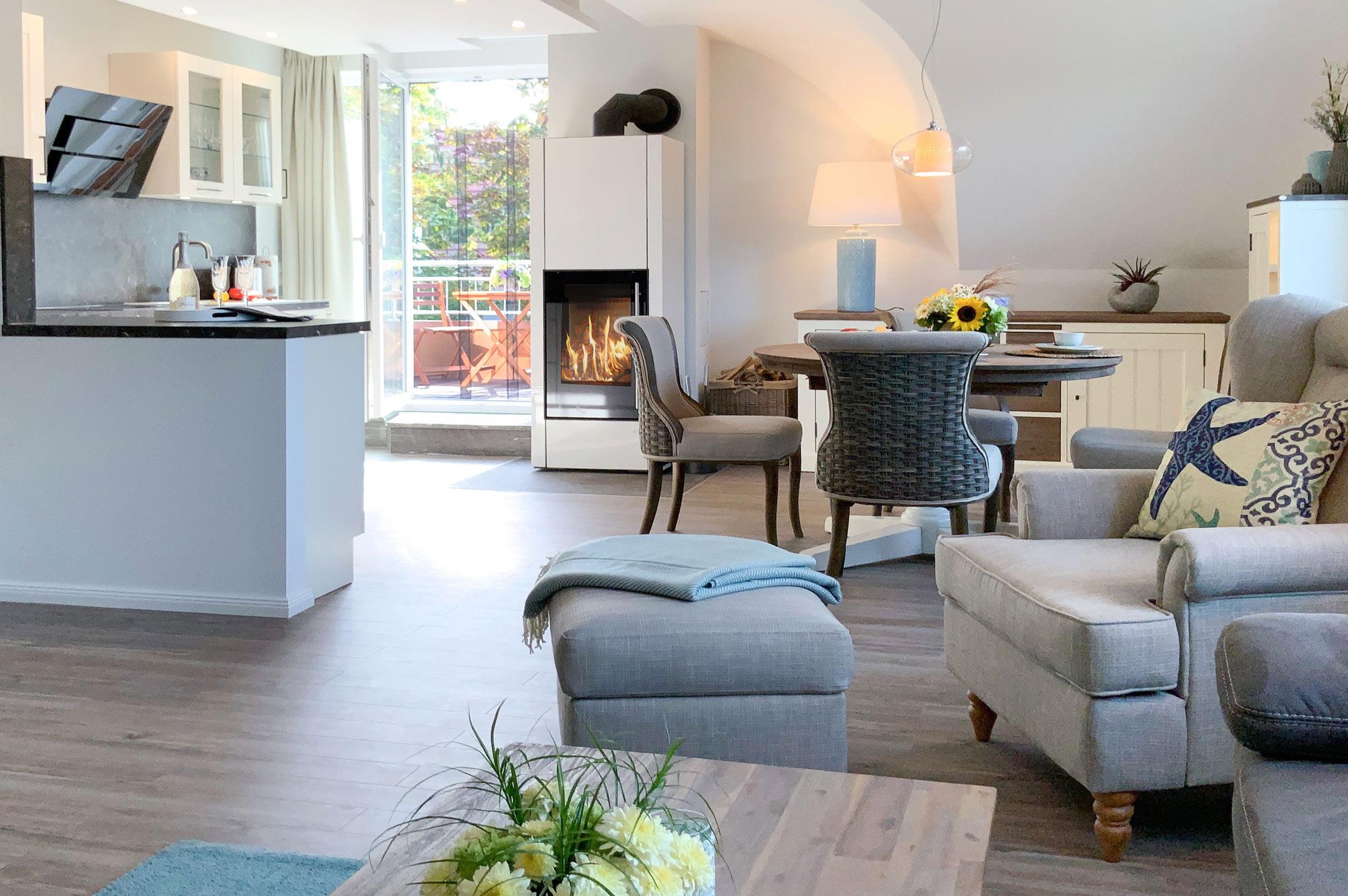 Die Ferienwohnung "Sterntaucher, Whg. 05" empfängt Sie mit einer harmonischen Kombination aus modernem Komfort und maritimem Ambiente. Der helle Wohnbereich mit Kaminofen lädt zu entspannten Stunden ein, während die voll ausgestattete Küche keine Wünsche offenlässt. Genießen Sie Ihre Mahlzeiten auf dem sonnigen Südbalkon mit gemütlichen Loungemöbeln. Das moderne Badezimmer mit eigener Infrarot-Sauna und das ruhig gelegene Schlafzimmer bieten zusätzlichen Komfort für erholsame Nächte.