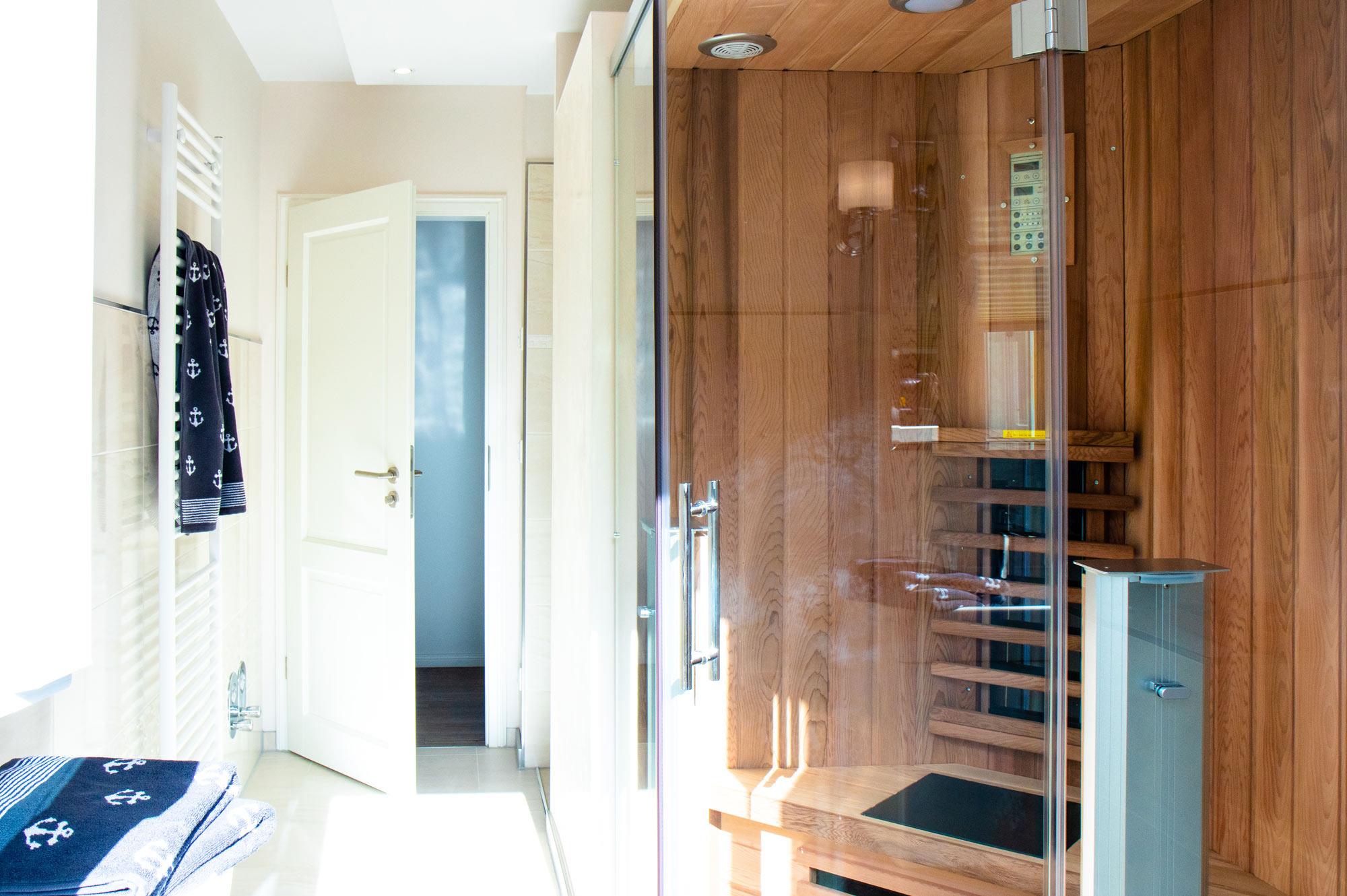Badezimmer: Modernes Bad mit ebenerdiger Dusche, Fußbodenheizung, Haartrockner und eigener Infrarot-Sauna für wohltuende Entspannung
