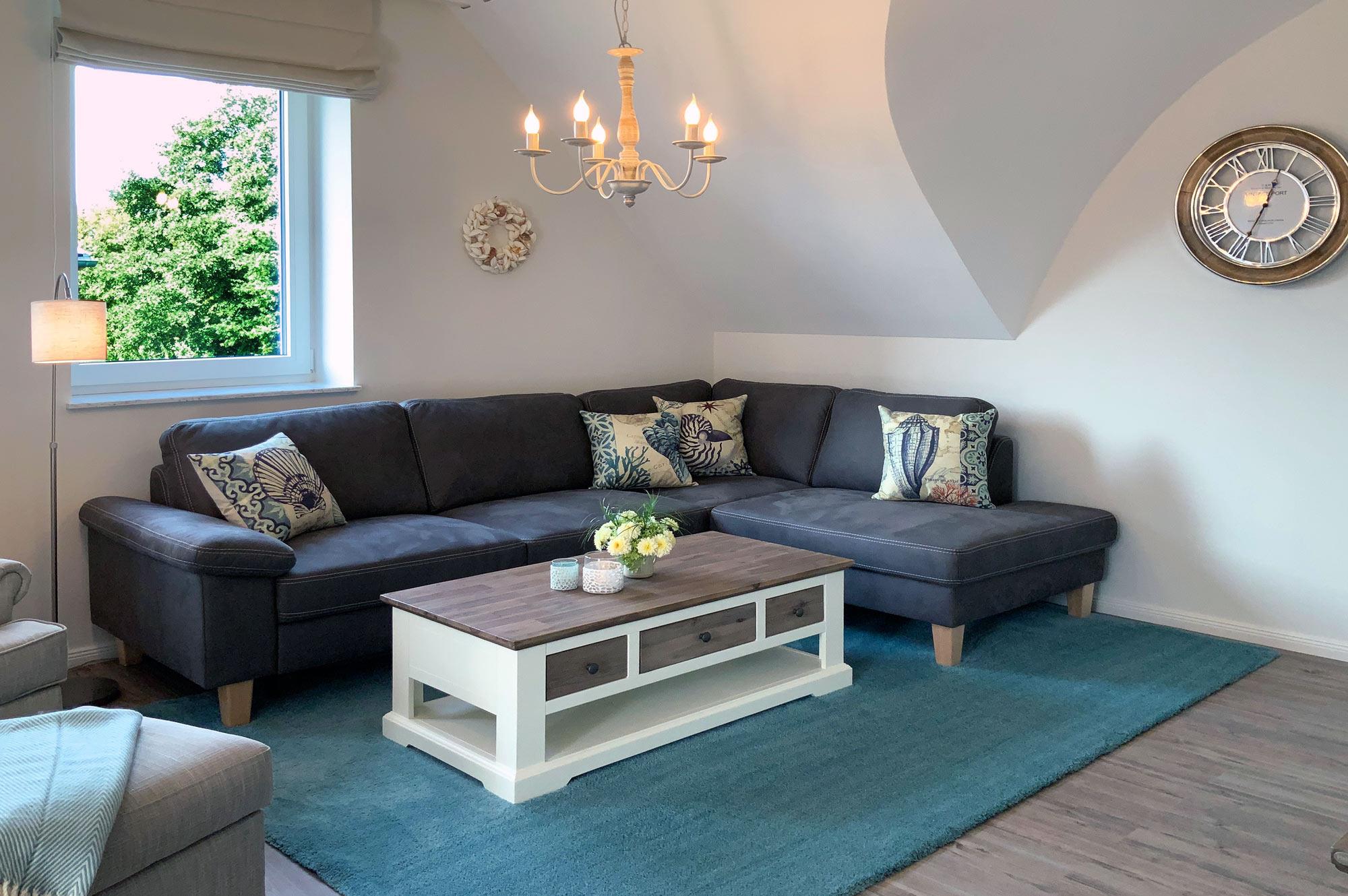 Wohnbereich: Heller Wohnraum mit bequemer Couch, Kaminofen für gemütliche Abende und direktem Zugang zum Südbalkon