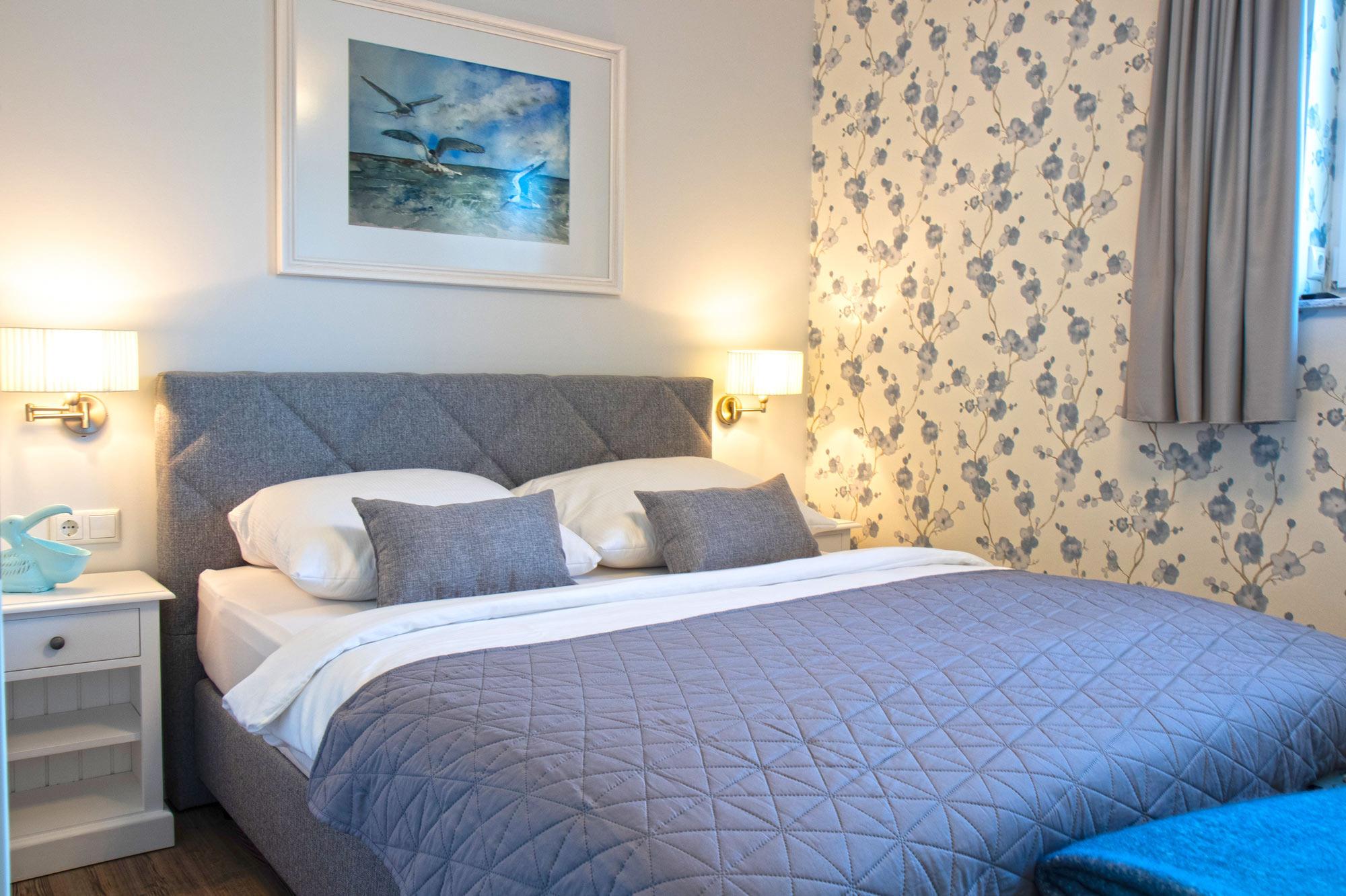 Schlafzimmer: Ruhig gelegenes Schlafzimmer mit komfortablem Doppelbett (160 x 200 cm) und lichtundurchlässigen Gardinen für erholsame Nächte