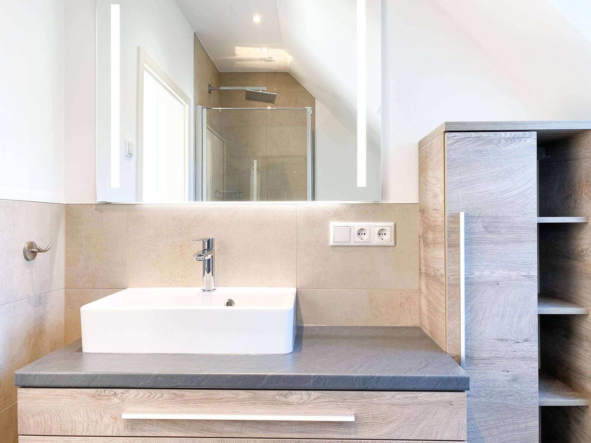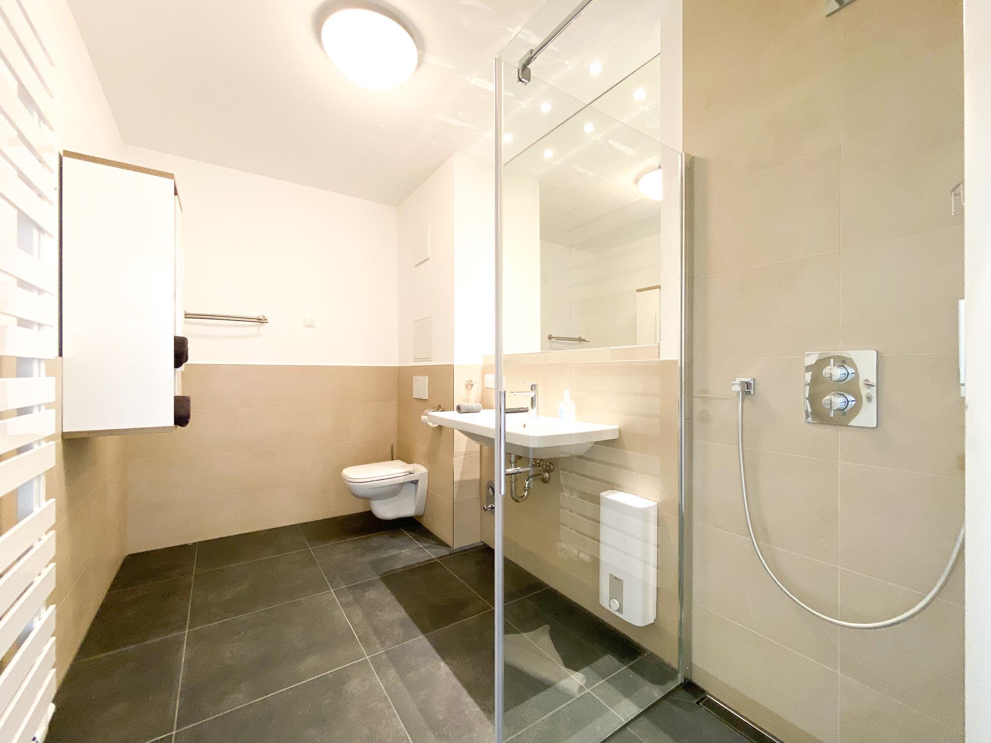 Badezimmer: Zwei moderne Bäder mit bodengleichen Regenduschen, Handtuchheizkörpern und Abluftanlagen.