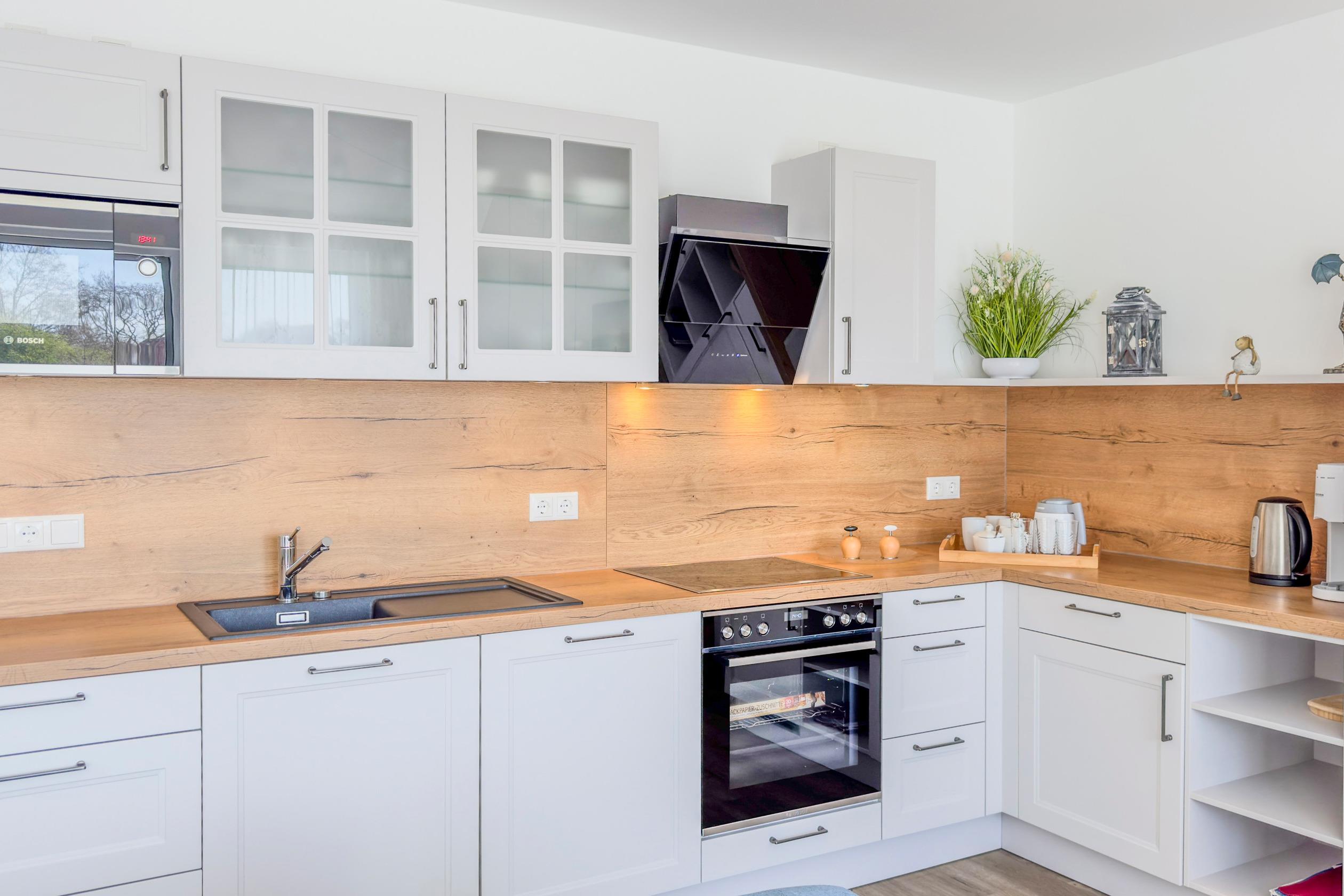 Küche: Voll ausgestattete Küche mit Backofen, Geschirrspüler, Kühlschrank, Mikrowelle, Filterkaffeemaschine, Toaster und Wasserkocher. Geräumige Schränke bieten ausreichend Stauraum.