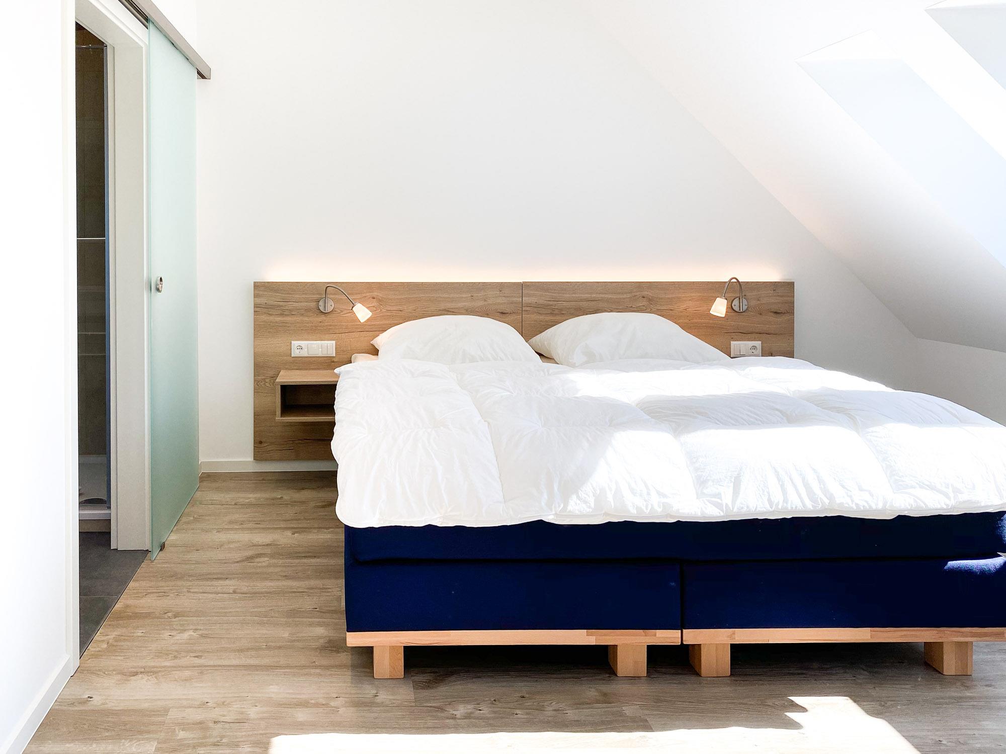 Schlafzimmer: Zwei Schlafzimmer mit modernen Boxspringbetten, geeignet für Allergiker. Ein Schlafzimmer verfügt über einen Schreibtisch, ideal für Arbeit oder Studium.