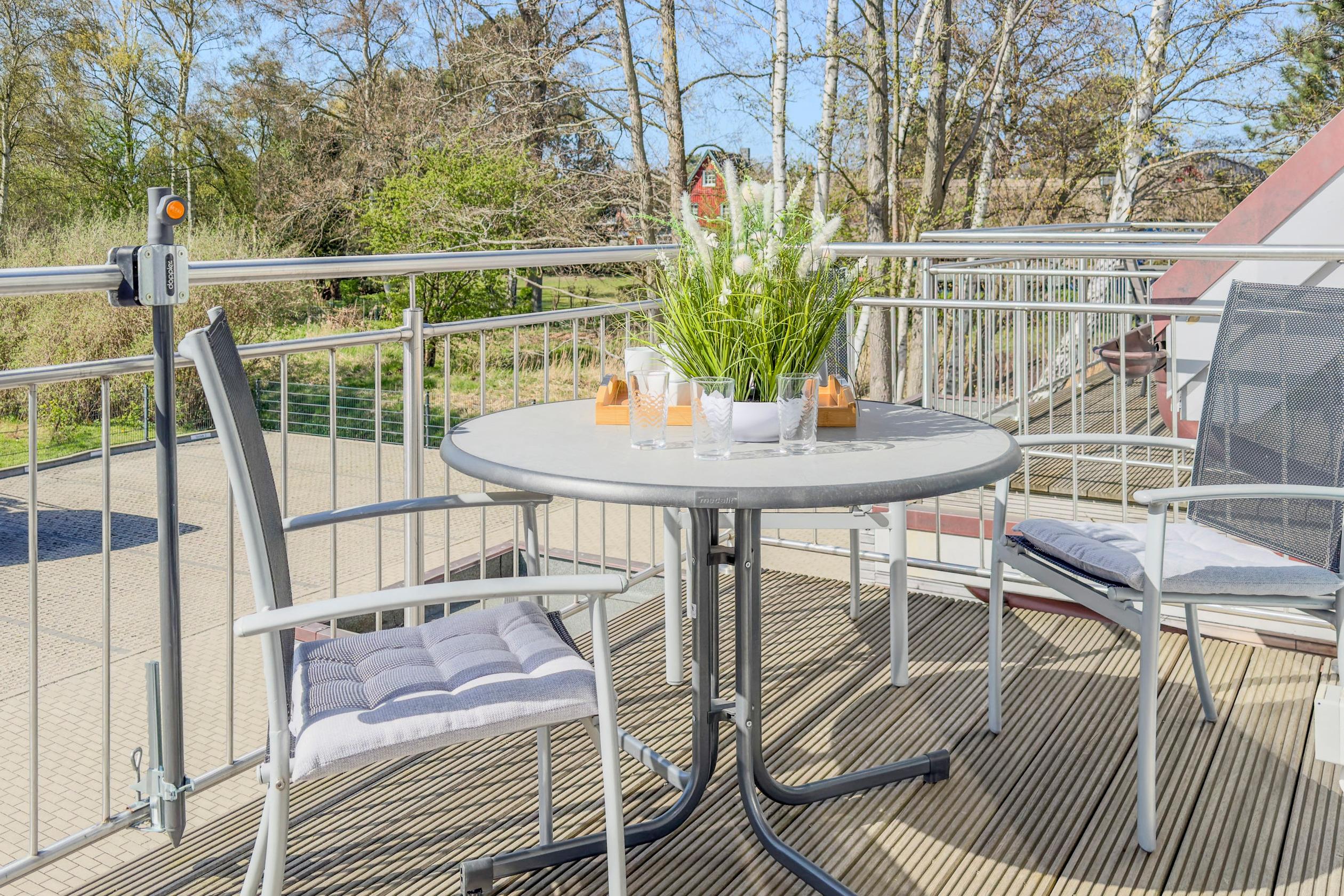 Balkon: Westlich ausgerichteter Balkon mit Sitzgruppe, ideal zum Entspannen und Genießen des milden Ostseeklimas.