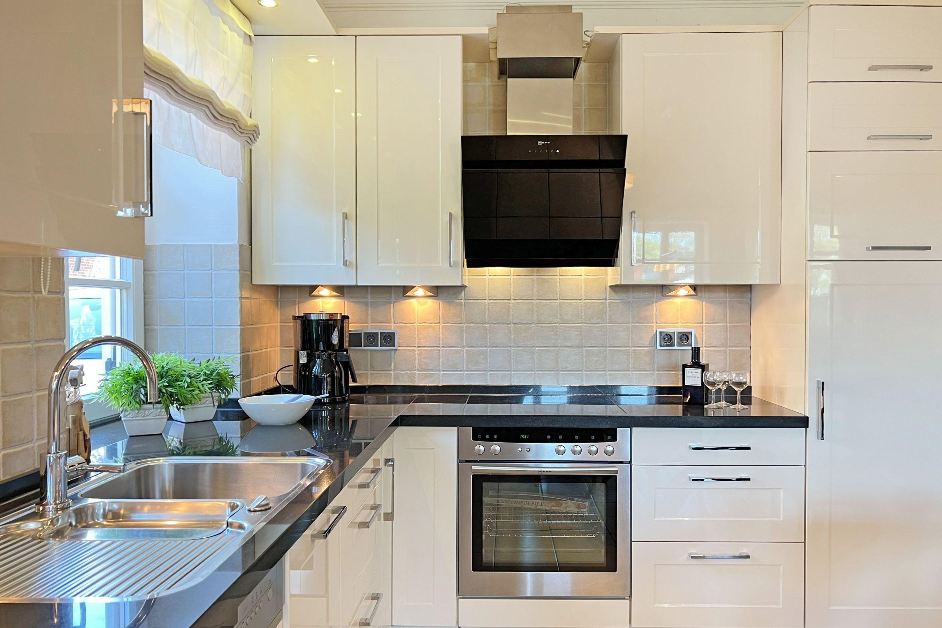 Voll ausgestattete offene Küche mit Geschirrspüler, Backofen, Kochfeld, Kühlschrank, Filterkaffeemaschine, Toaster, Wasserkocher, Eierkocher und Küchenmixer