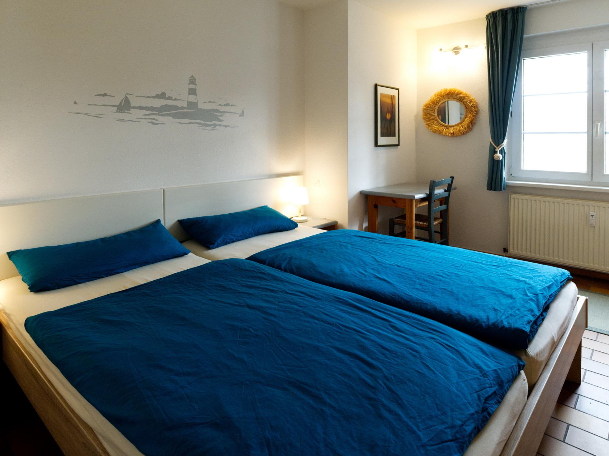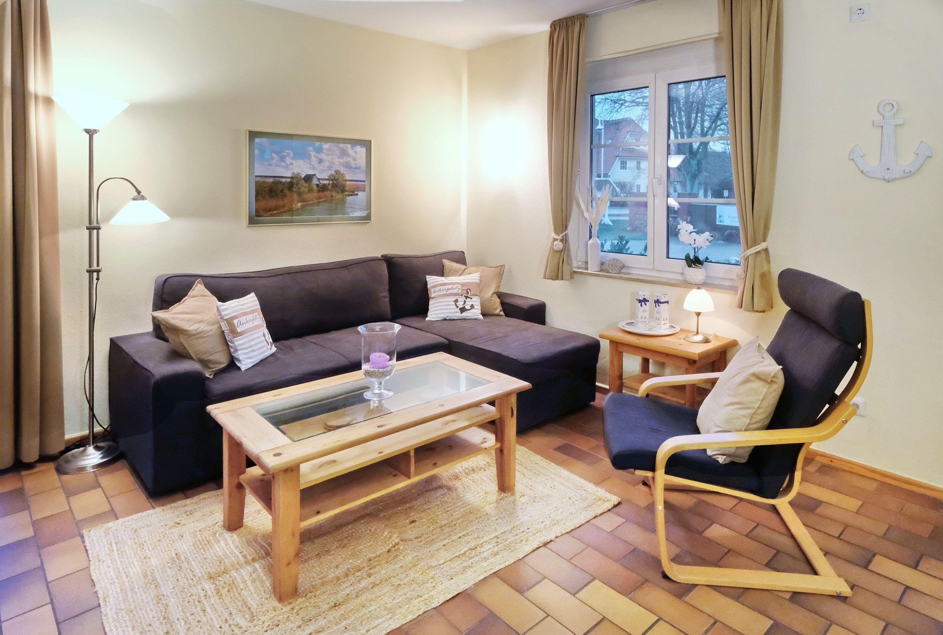 Die Ferienwohnung liegt im EG eines reetgedeckten Ferienhauses und besteht aus einem Wohnraum mit Einbauküche, einem großzügigen Schlafraum, einem Bad mit Dusche und WC, sowie einem zusätzlichen Gäste-WC.