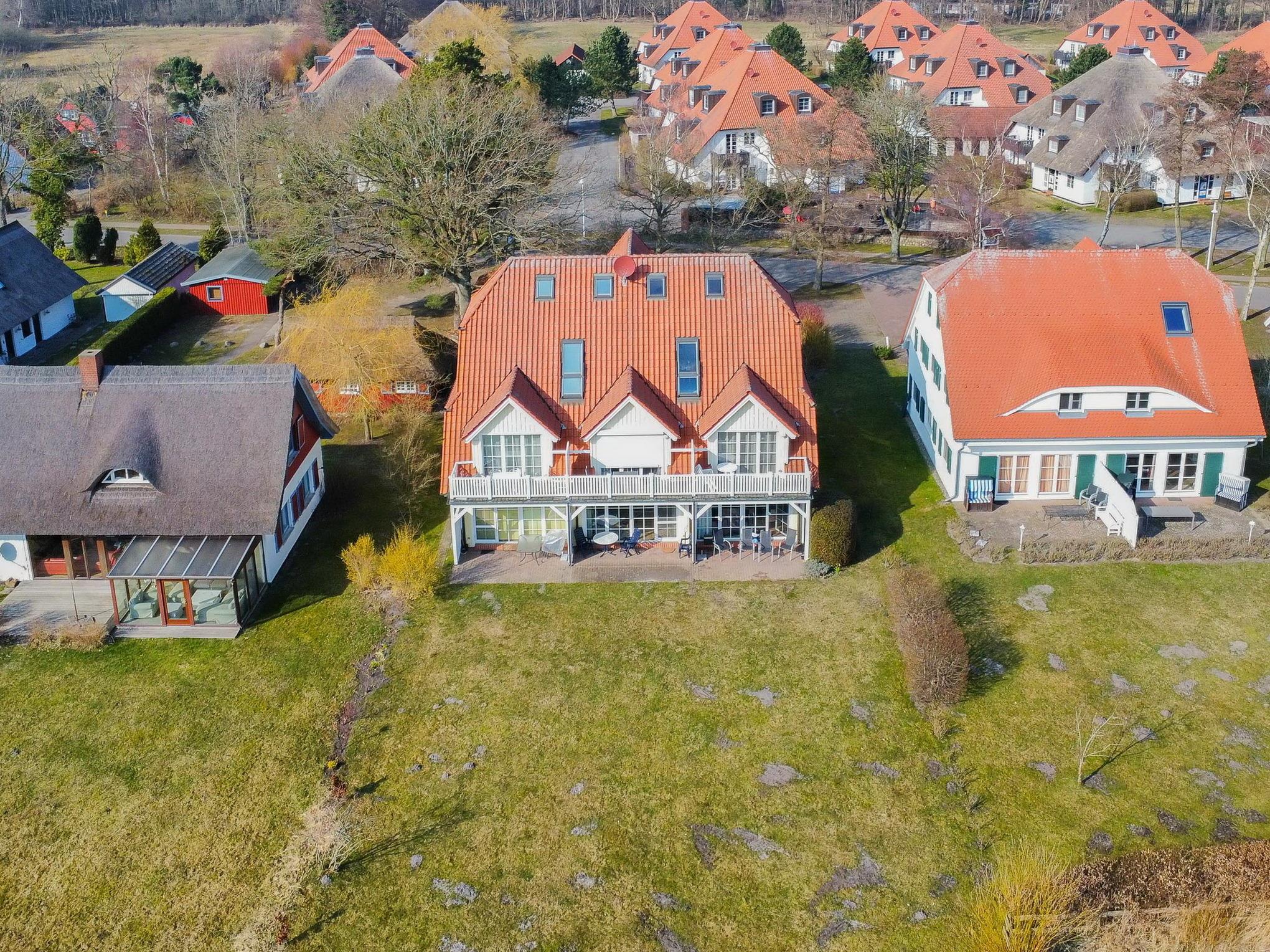 Die ca. 48 qm große, gemütlich und mit viel Liebe zum Detail eingerichtete 3-Zimmer Ferienwohnung - oben links- liegt in einem sehr ruhig, mitten im Grünen des Ostseebades Prerow gelegenen Ferienhaus, nahe zum Weststrand.