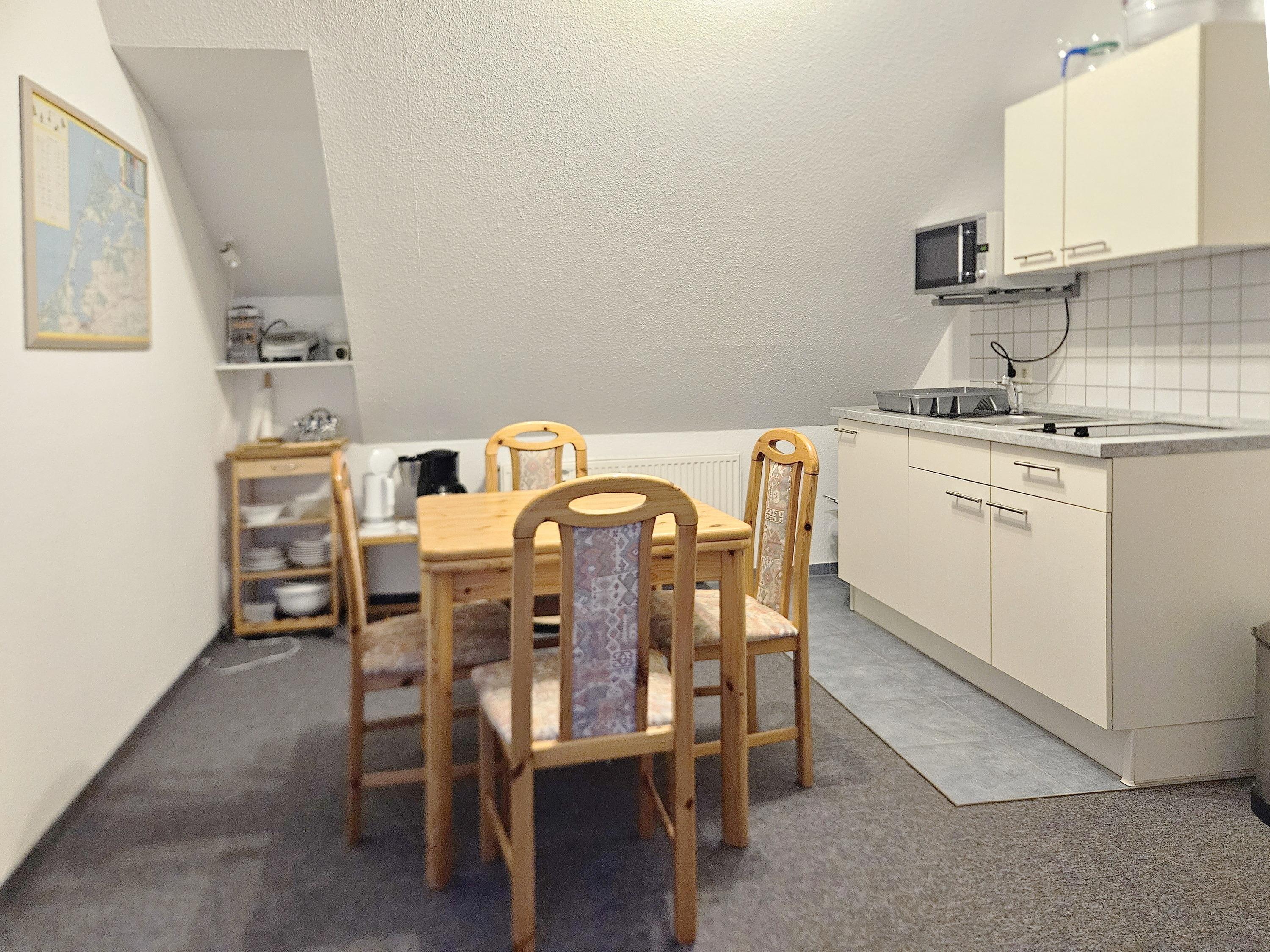 Die Ferienwohnung befindet sich im ersten Obergeschoss und besteht aus einem Raum, der einen Wohn- und Küchenbereich mit Esstisch sowie einen Schlafbereich mit einem Doppelbett beinhaltet. Das dazugehörige Badezimmer verfügt über eine Dusche und ein WC. In der gesamten Wohnung sind Dachschrägen vorhanden. Es gibt keine Türen zwischen dem Wohn- und Schlafbereich. Vor dem Haus steht ein kostenloser Parkplatz zur Verfügung. Im Gemeinschaftsschuppen können Fahrräder abgestellt werden. Außerdem gibt es im Haus eine Waschmaschine und einen Trockner, die gegen Gebühr von allen Bewohnern genutzt werden können.