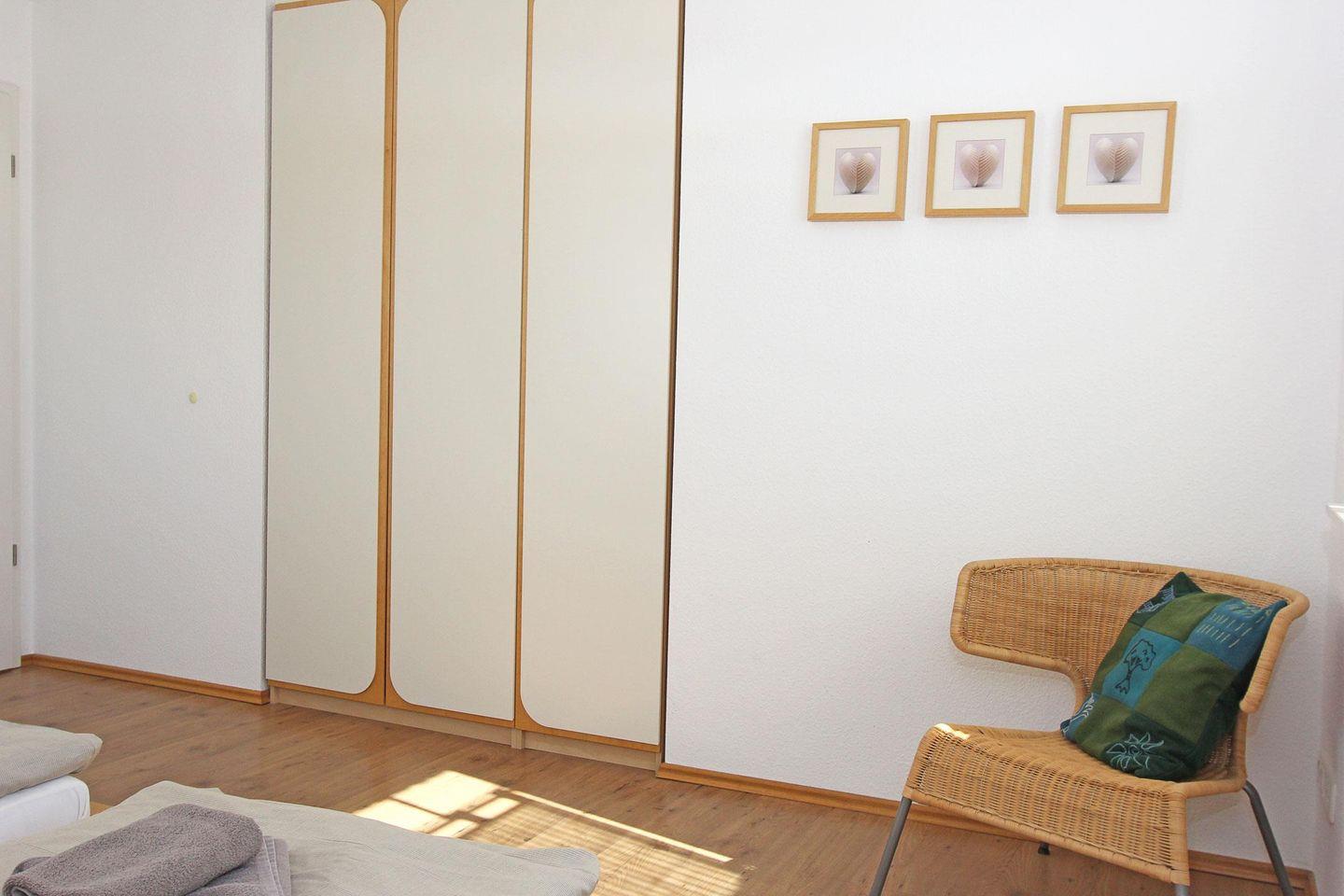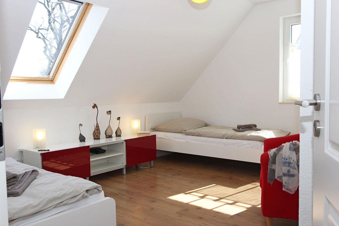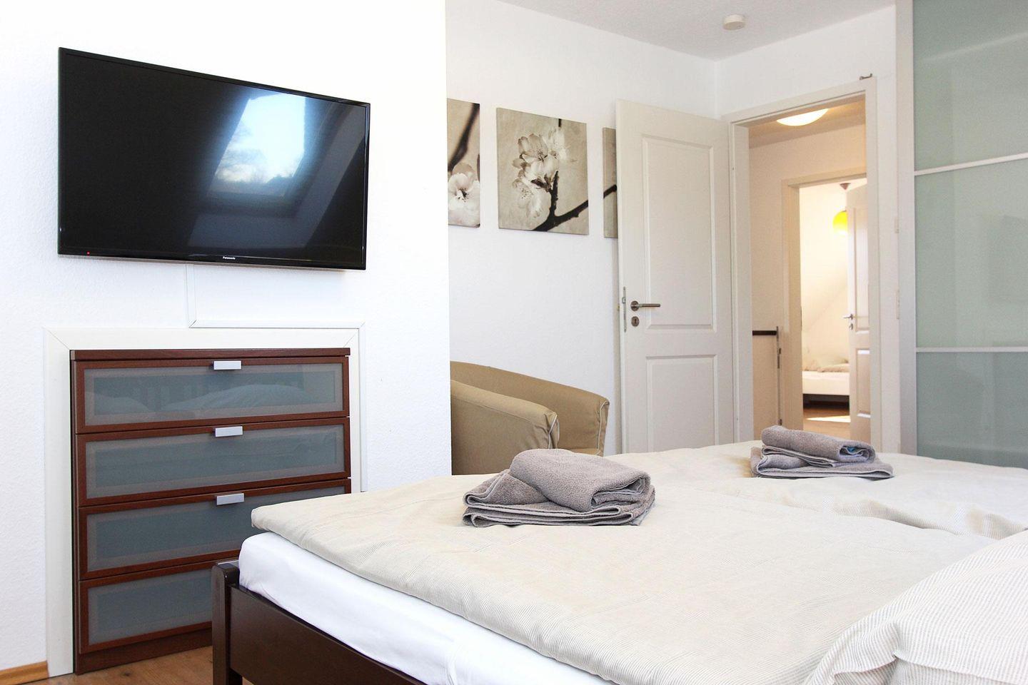 Im Obergeschoss befinden sich die drei Schlafräume, zwei davon sind ausgestattet mit je einem Doppelbett und einem großen Kleiderschrank, eines davon mit Fernseher und das dritte Zimmer mit zwei Einzelbetten.