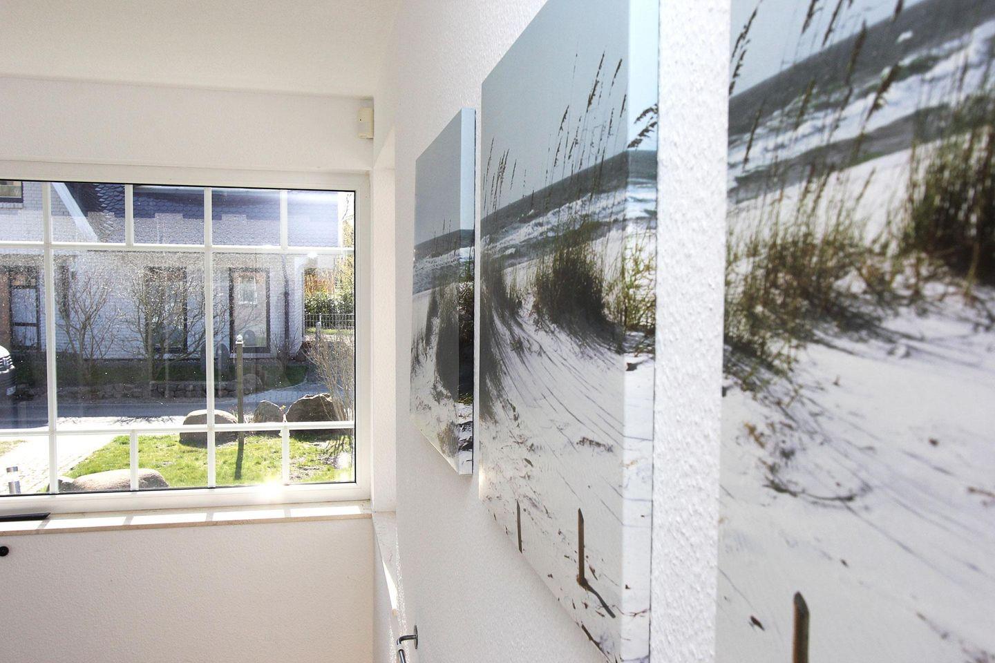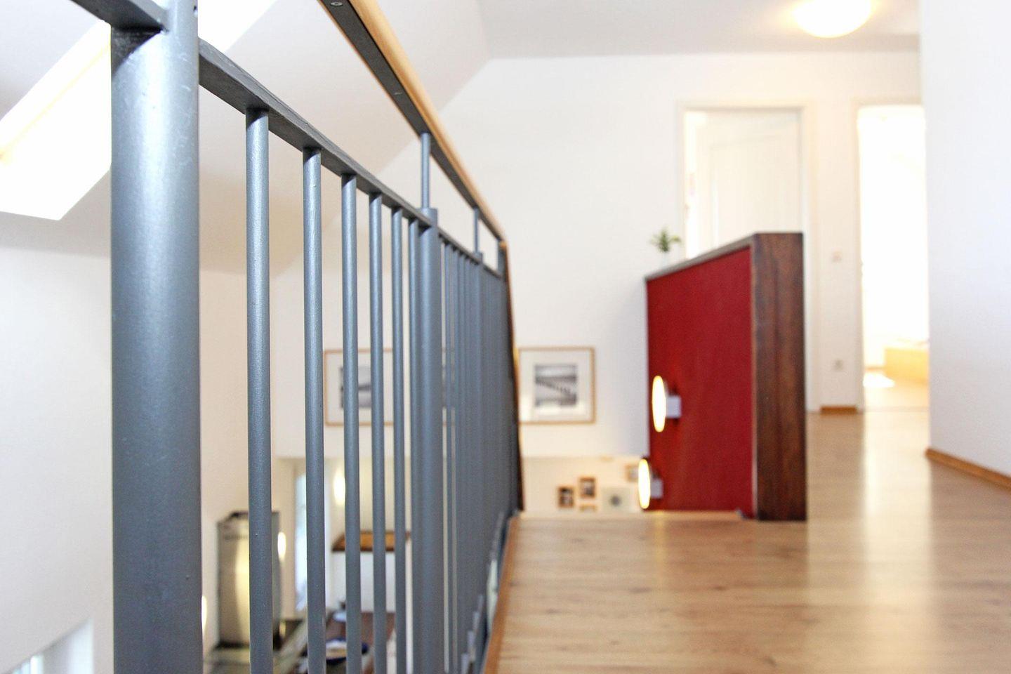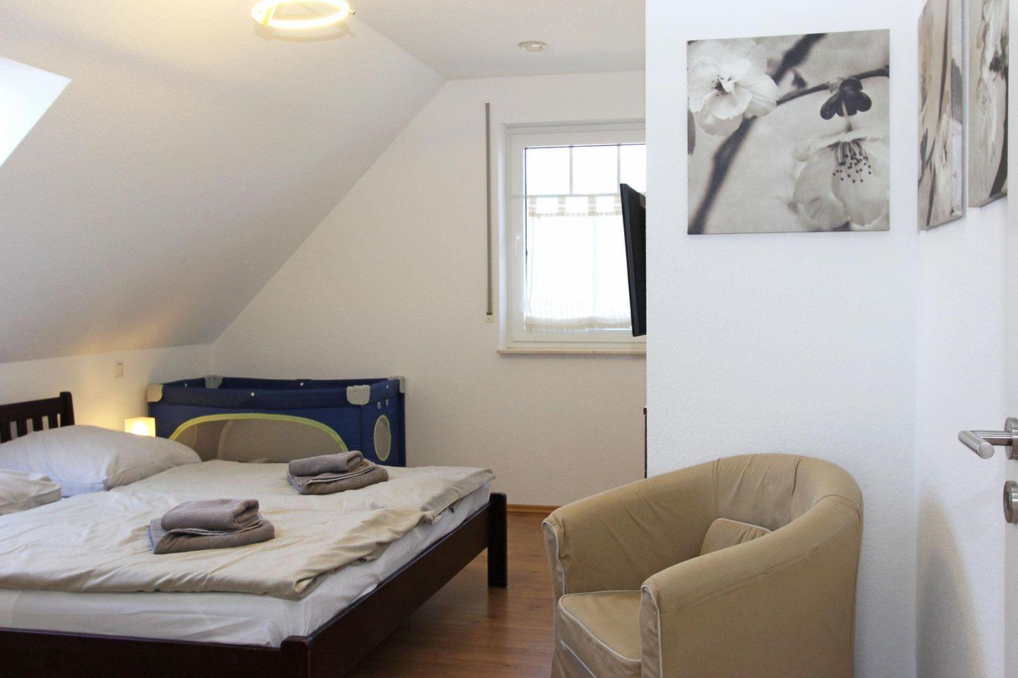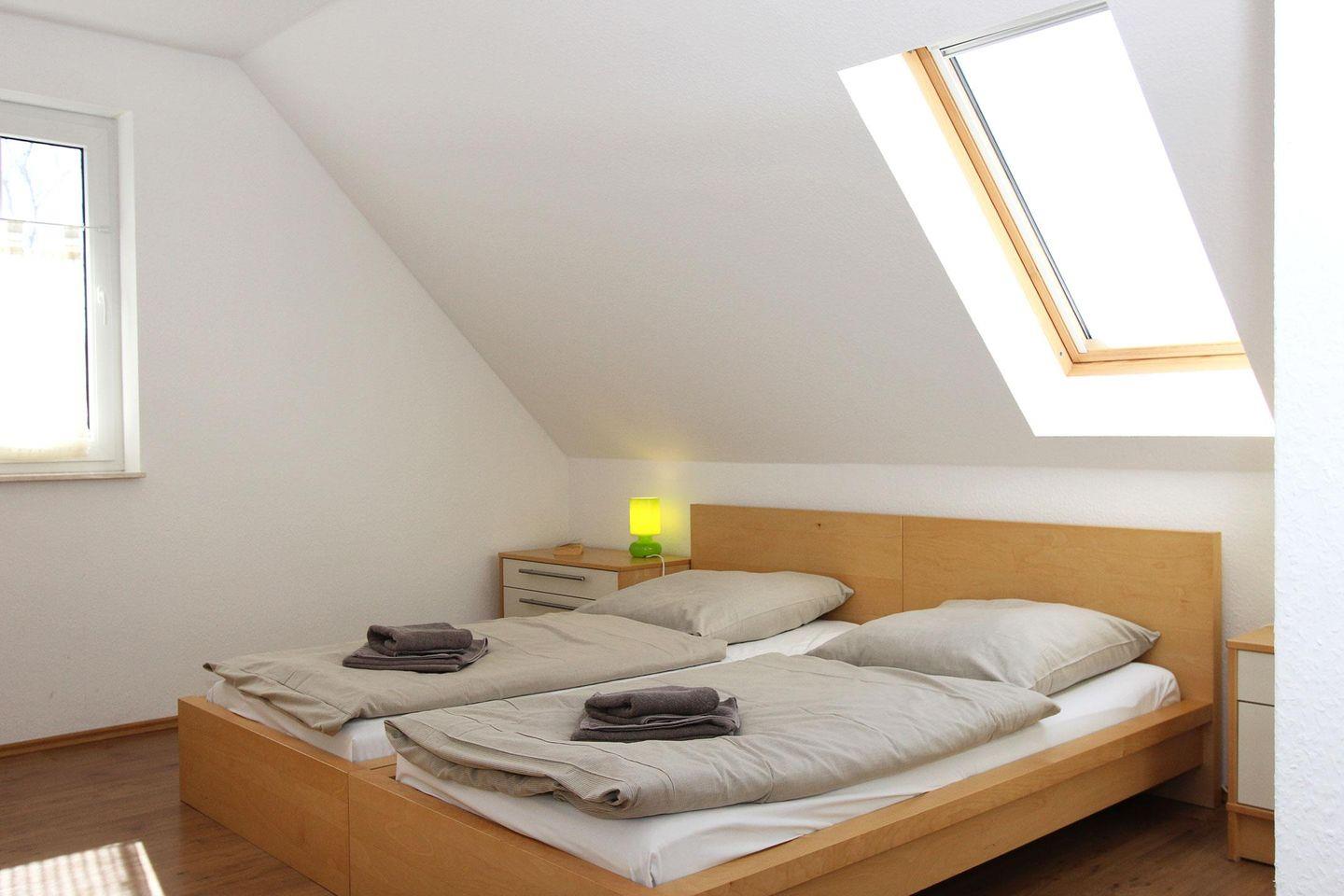 Im Obergeschoss befinden sich die drei Schlafräume, zwei davon sind ausgestattet mit je einem Doppelbett und einem großen Kleiderschrank, eines davon mit Fernseher und das dritte Zimmer mit zwei Einzelbetten.