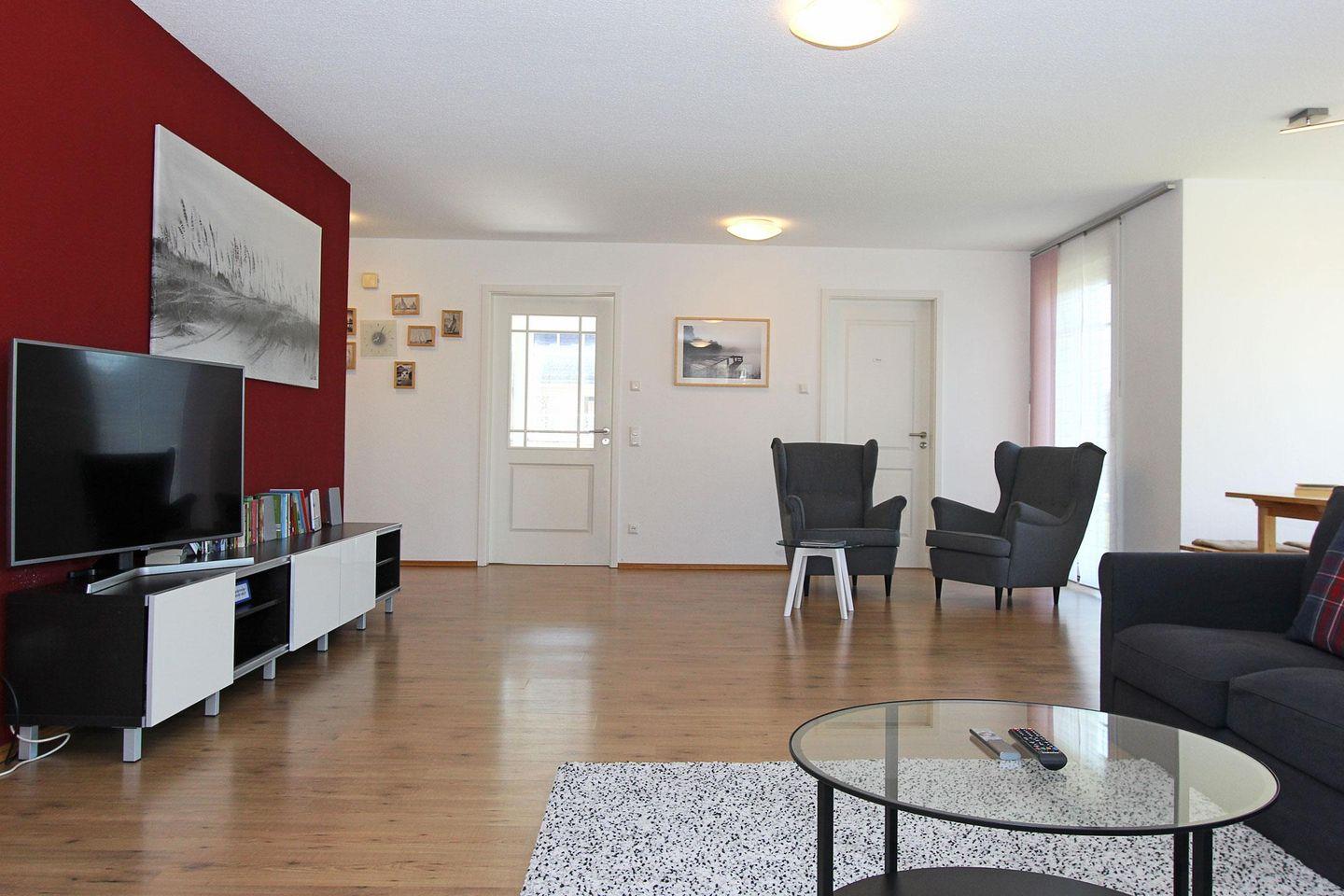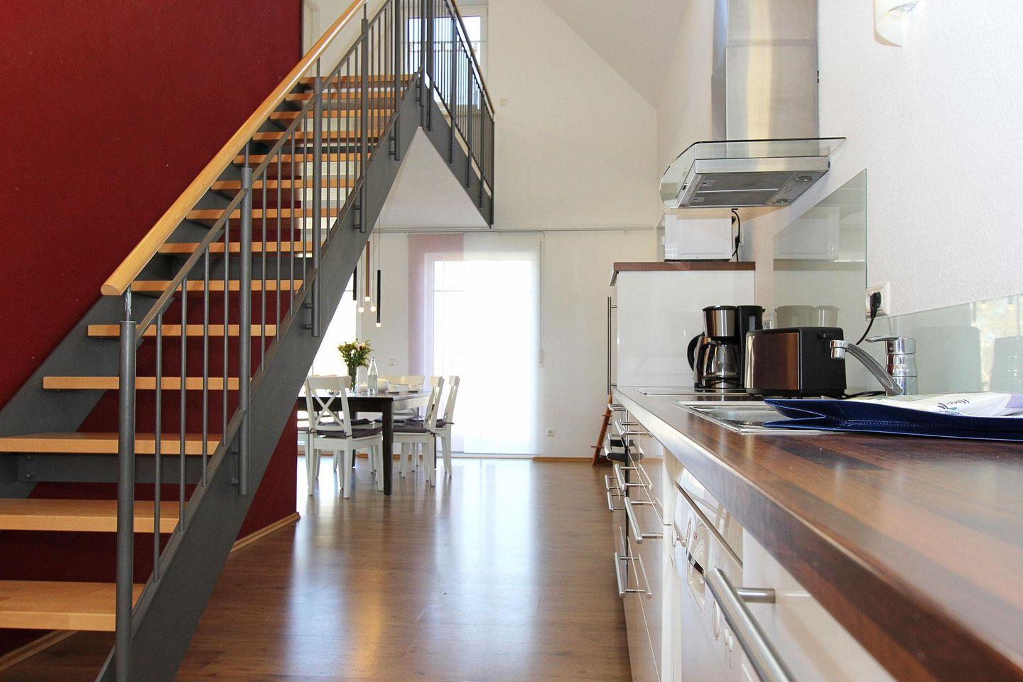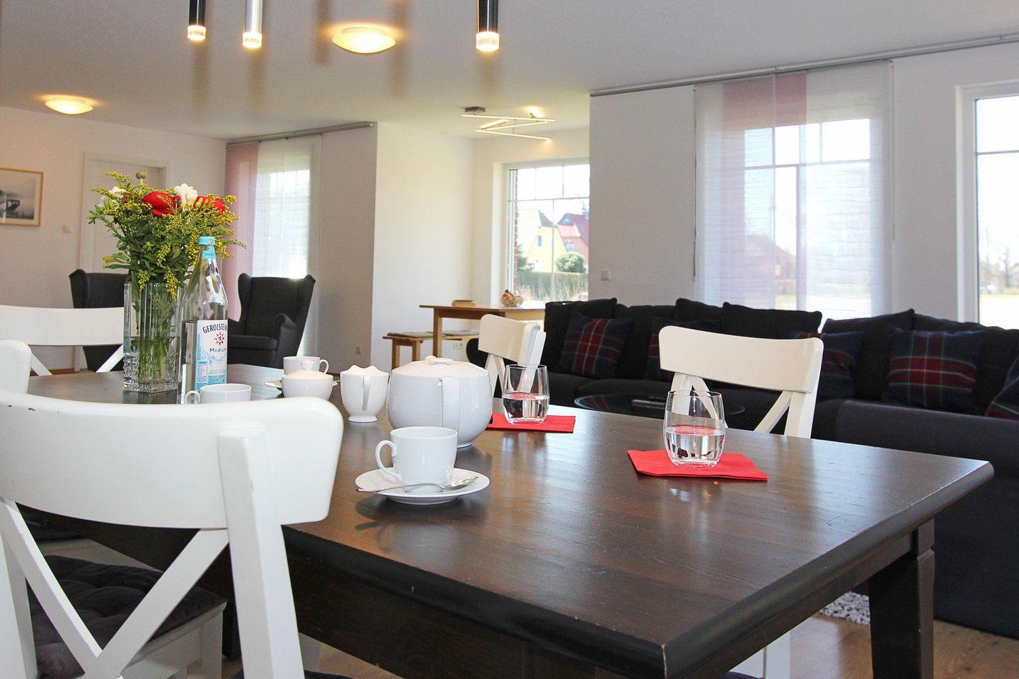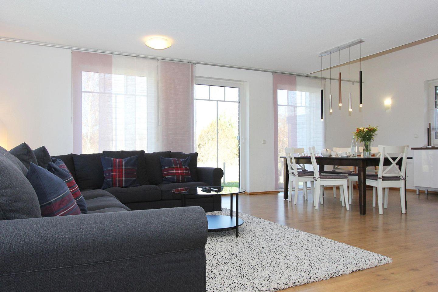 Das Haus hat einen sehr großen und hellen Wohnbereich, welcher mit zwei gemütlichen Couchs, einem Fernseher und zwei Essbereichen ausgestattet ist. Eine offene Küche, mit Herd/Backofen, Geschirrspüler und Mikrowelle lädt zum gemeinsamen kochen ein.