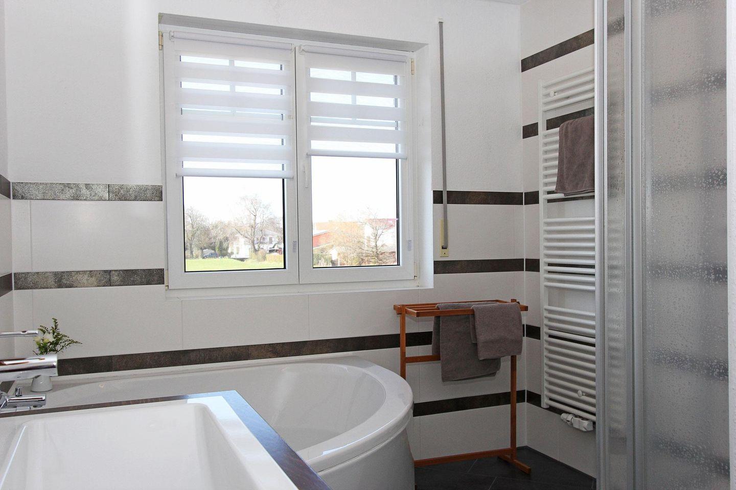 Das großzügige Badezimmer im Obergeschoss verfügt über eine Eckbadewanne, Dusche und Toilette.