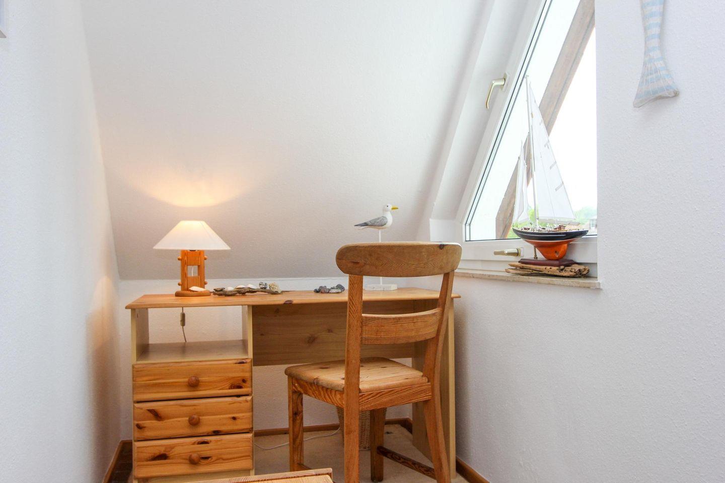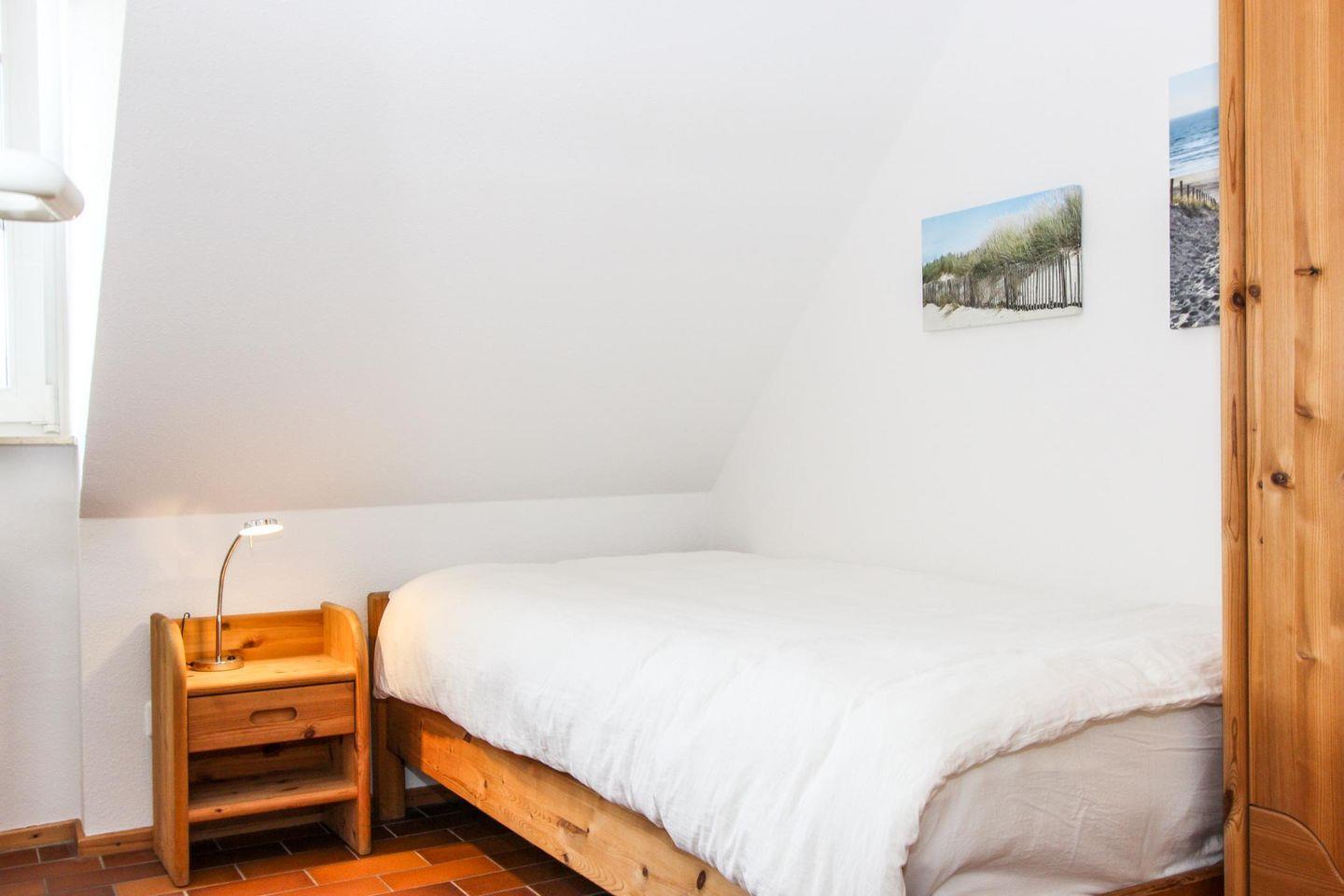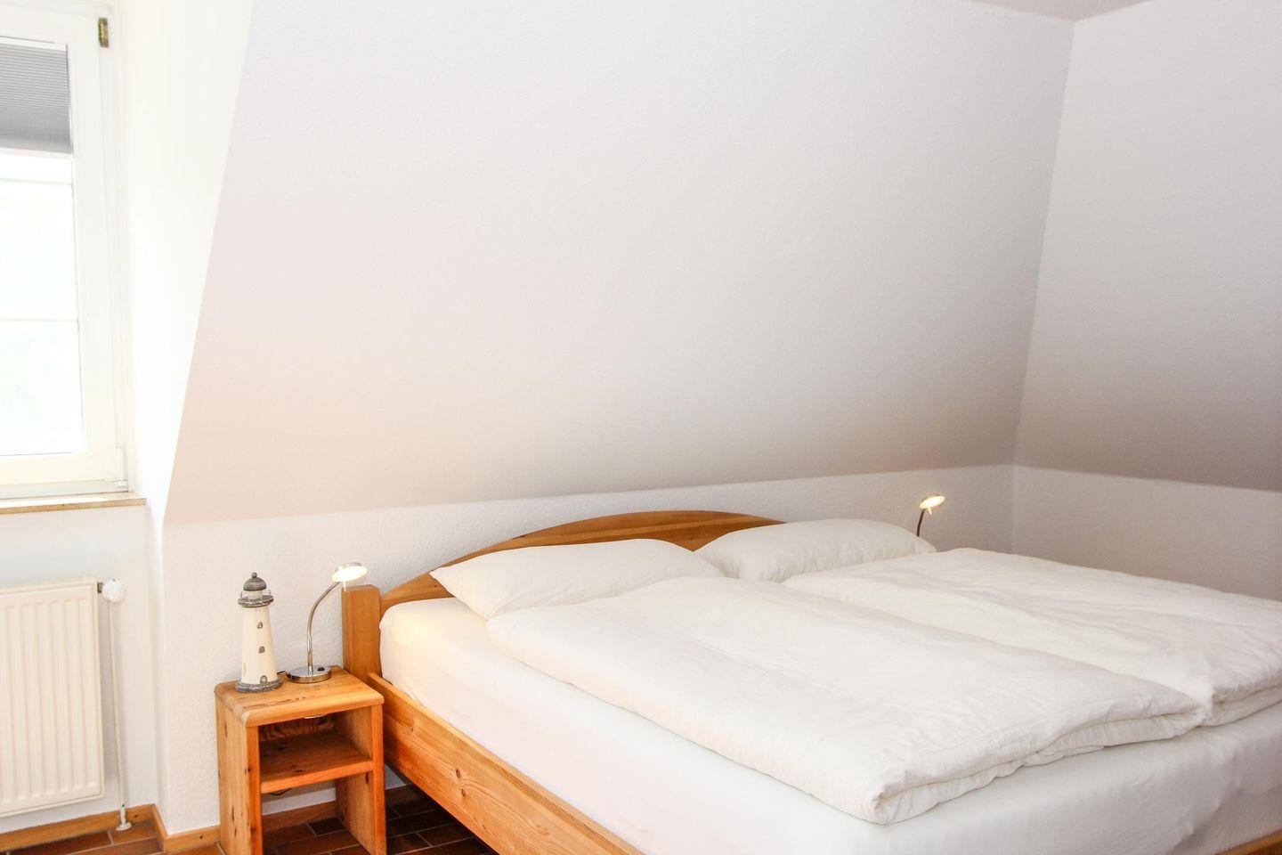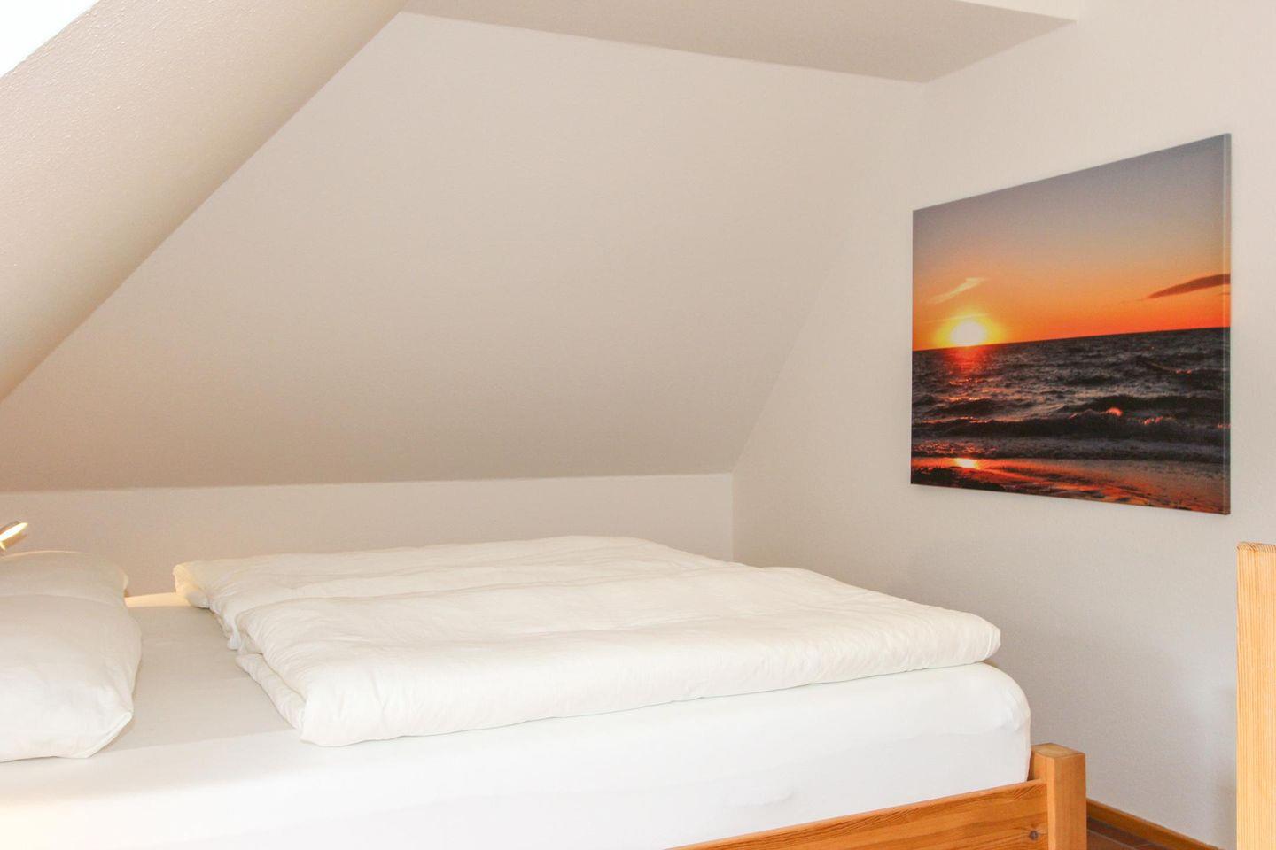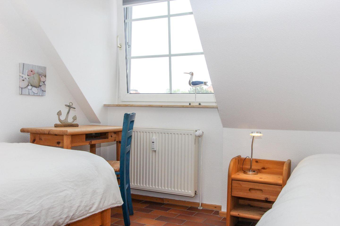 Im hellen Dachgeschoss der Wohnung befinden sich die zwei Schlafzimmer mit je einem Doppelbett und zwei Einzelbetten. Auf dieser Ebene befindet sich das zweite Duschbad mit WC.
