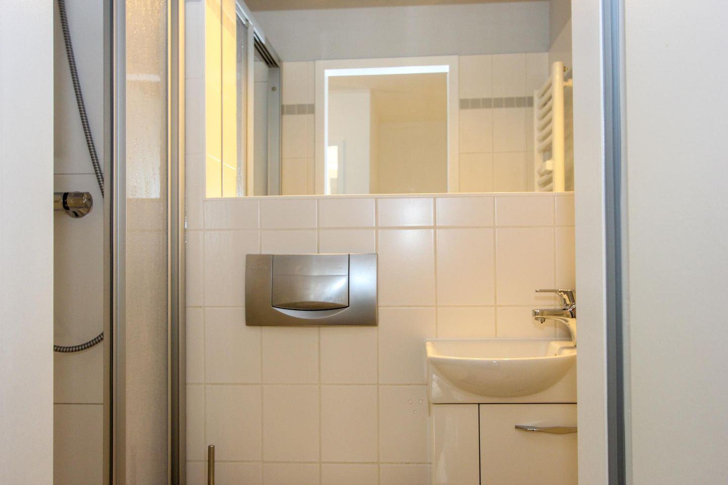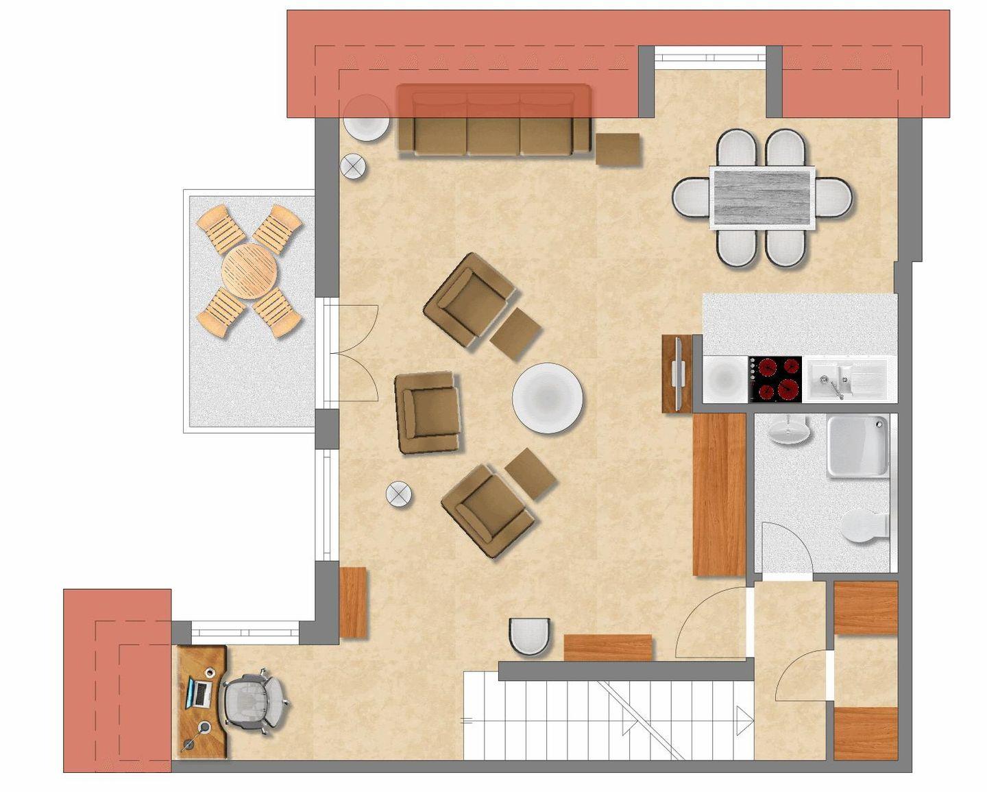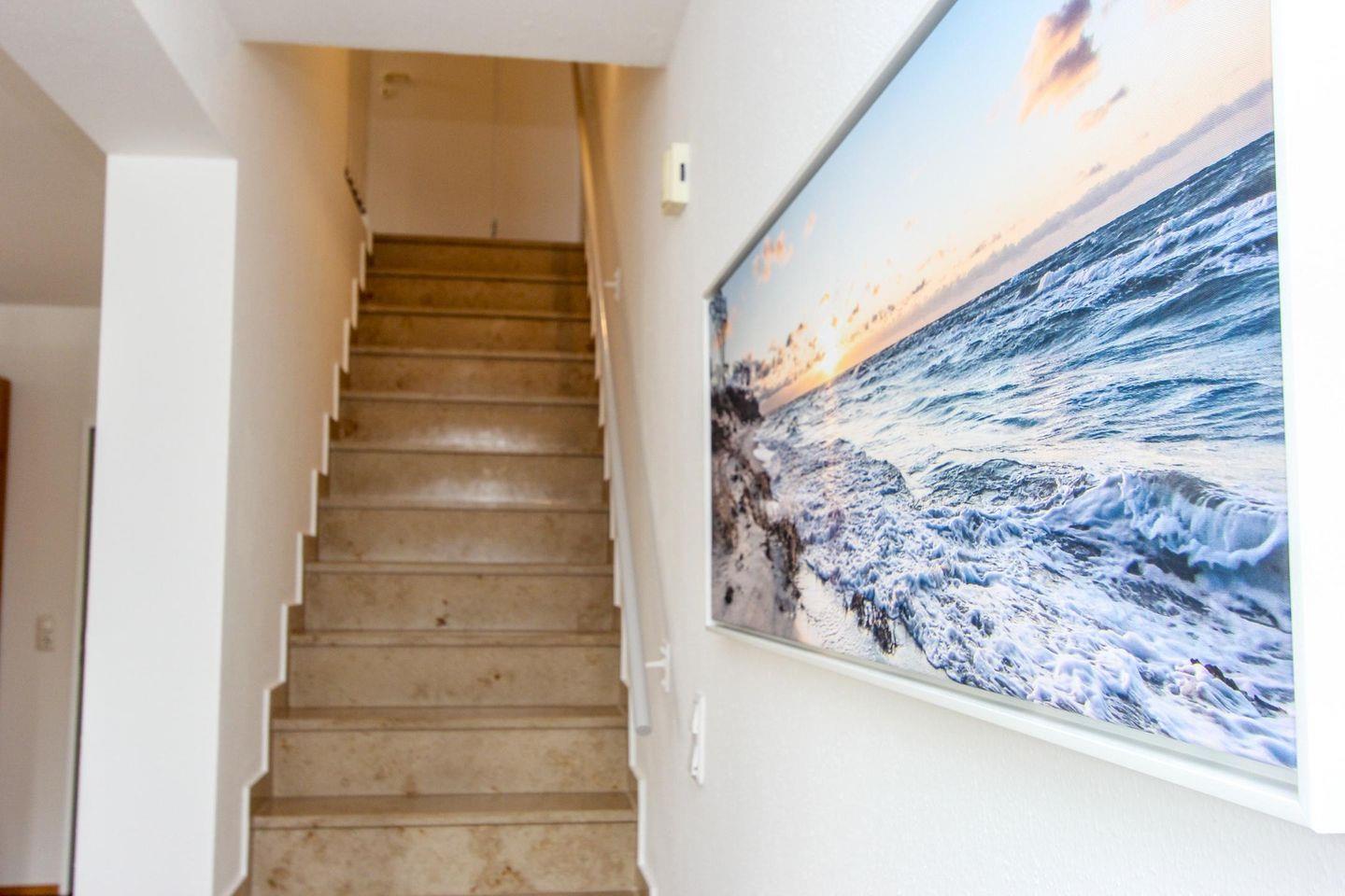 Vom Wohnzimmer aus gelangt man auf den Balkon, welcher nach Süd-Westen ausgerichtet ist. Hier lässt es sich ganz entspannt frühstücken oder zu Abend essen. Die gut ausgestattete, moderne Küche und der Esstisch befinden sich angrenzend zum Wohnzimmer. Auf dieser Etage befindet sich auch ein Duschbad mit WC.
