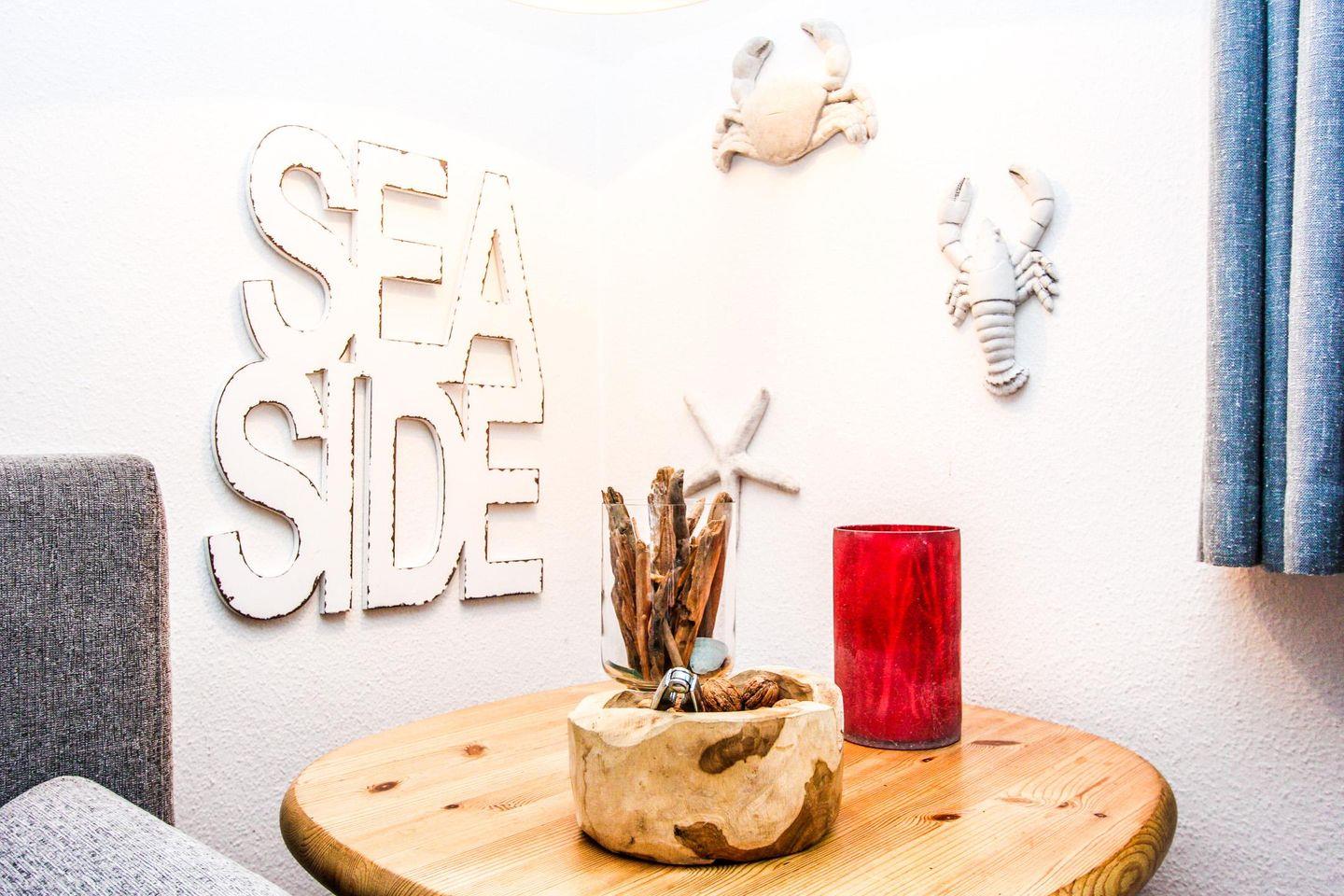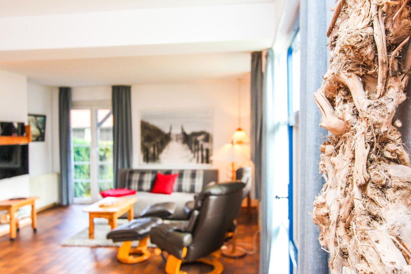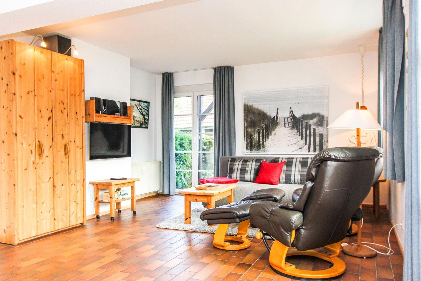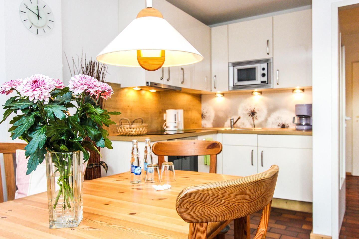 Durch die eigens genutzte, ortstypische Darßer Haustür gelangen Sie in das helle Wohnzimmer und den großen Essbereich der Wohnung mit der gut ausgestatteten, angrenzenden Küche. Über die Terrassentür betreten Sie die schöne Holzterrasse.