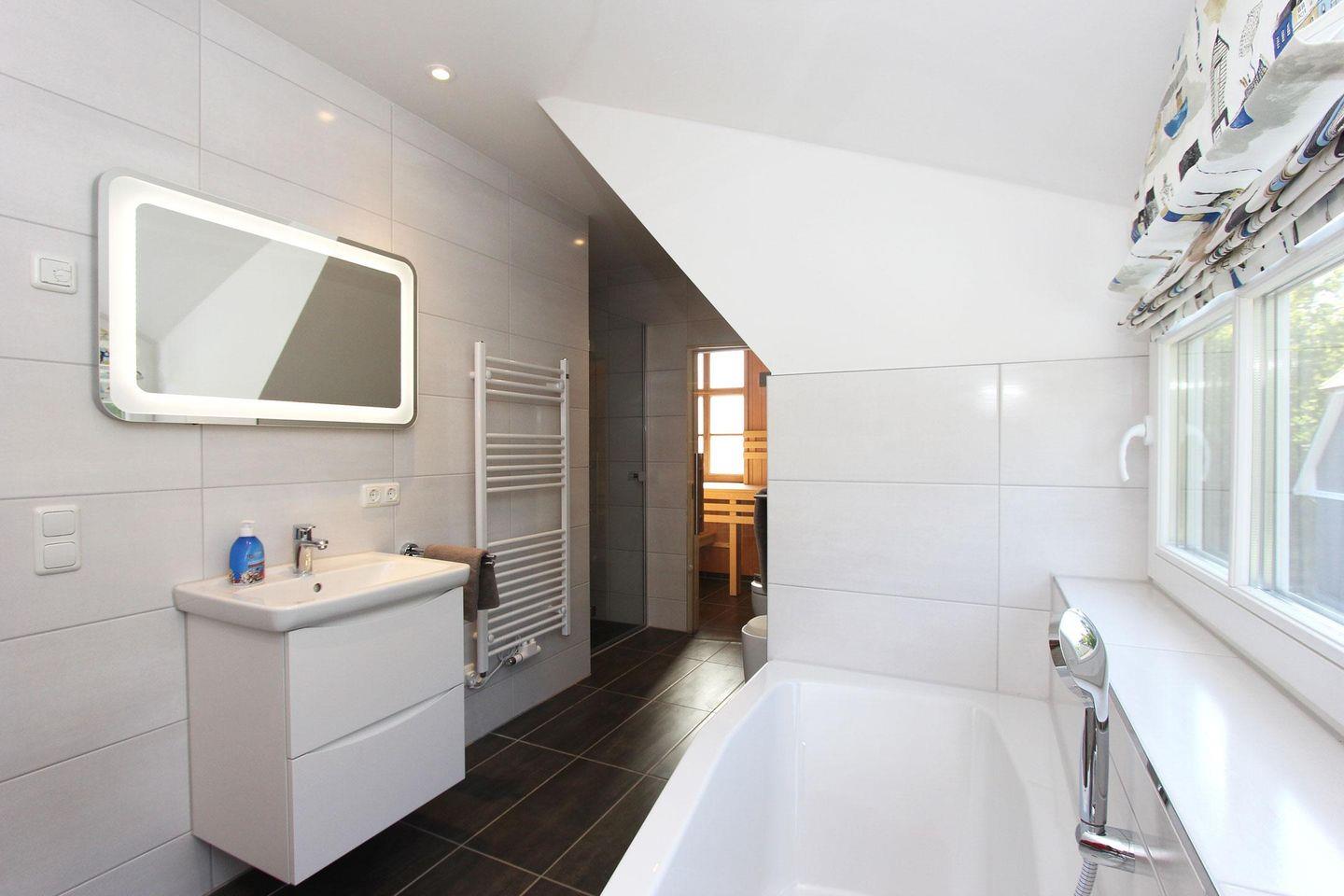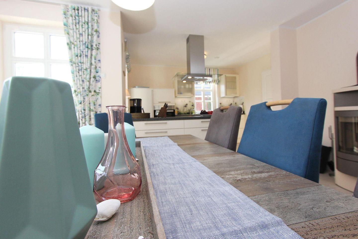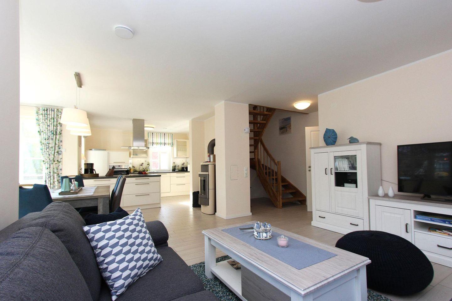 Die hochwertig ausgestattete und zum Wohnzimmer hin offene Küche lässt keine Wünsche offen. Ein großer Esstisch und eine gemütliche Couch komplettieren den Wohnkomfort. Das Haus verfügt im Erd- und Obergeschoss über ein Badezimmer. Eines mit einer geräumigen Dusche und das andere mit Dusche, Badewanne und angrenzender Sauna.