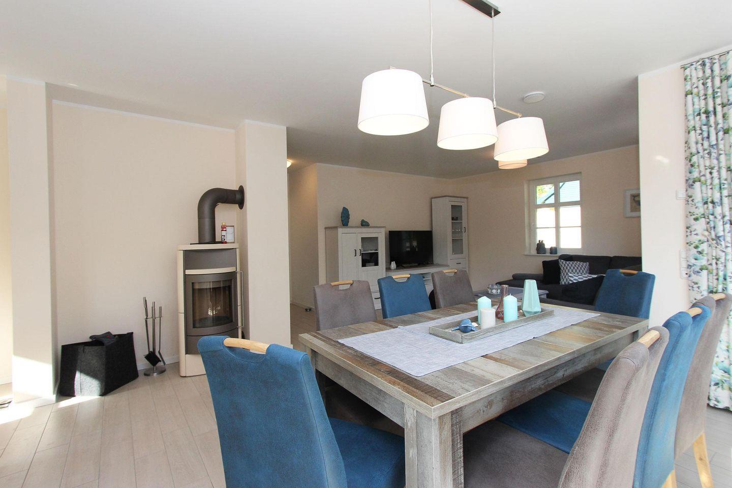 Der Lebensmittelpunkt des Hauses ist der großzügige Wohn -und Essbereich mit Kamin.