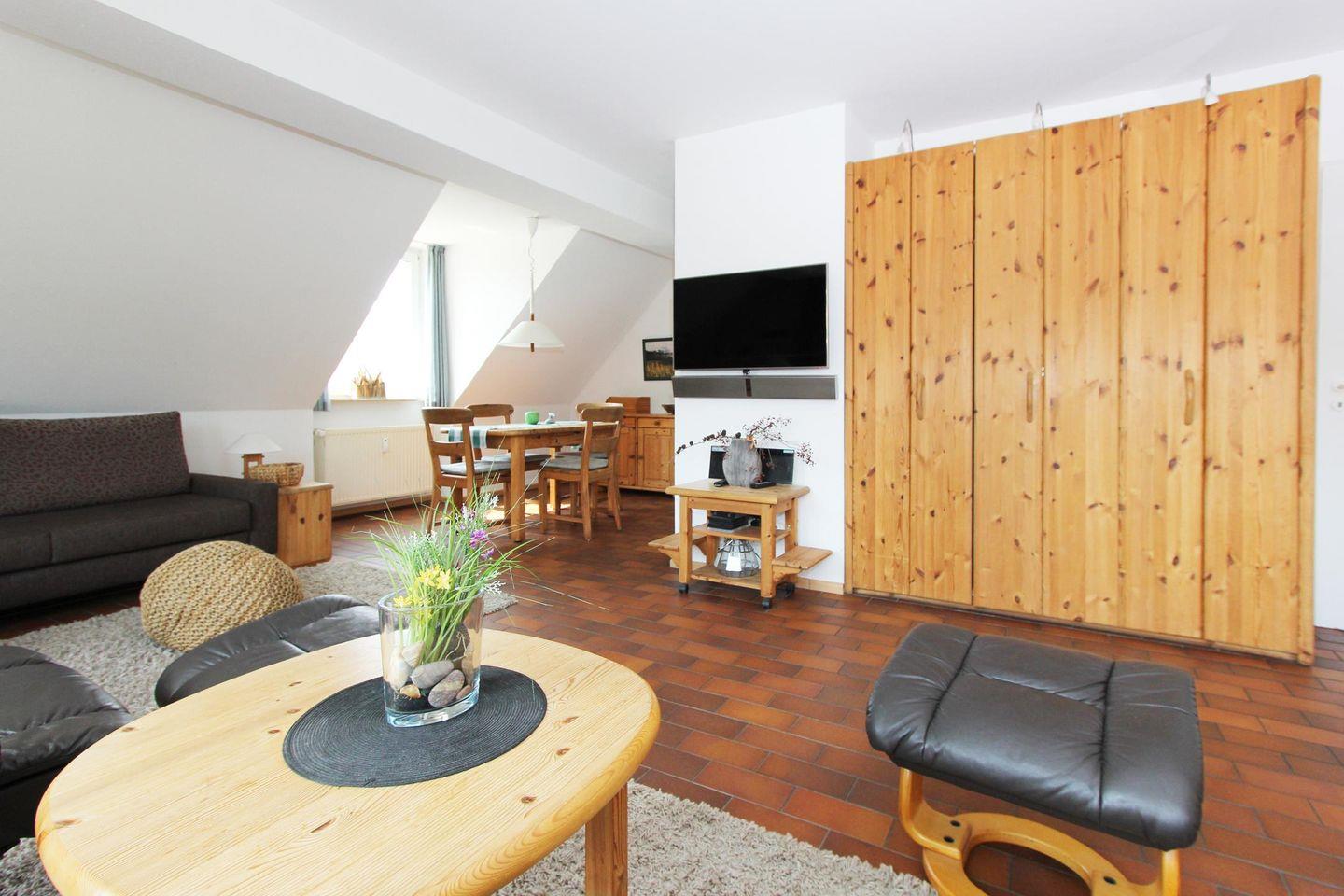 Die Maisonettewohnung erstreckt sich über das Ober- und Dachgeschoss. Die Wohnung hat ein sehr geräumiges und helles Wohnzimmer mit Fernsehcouch und gemütlichen Schwingsesseln.