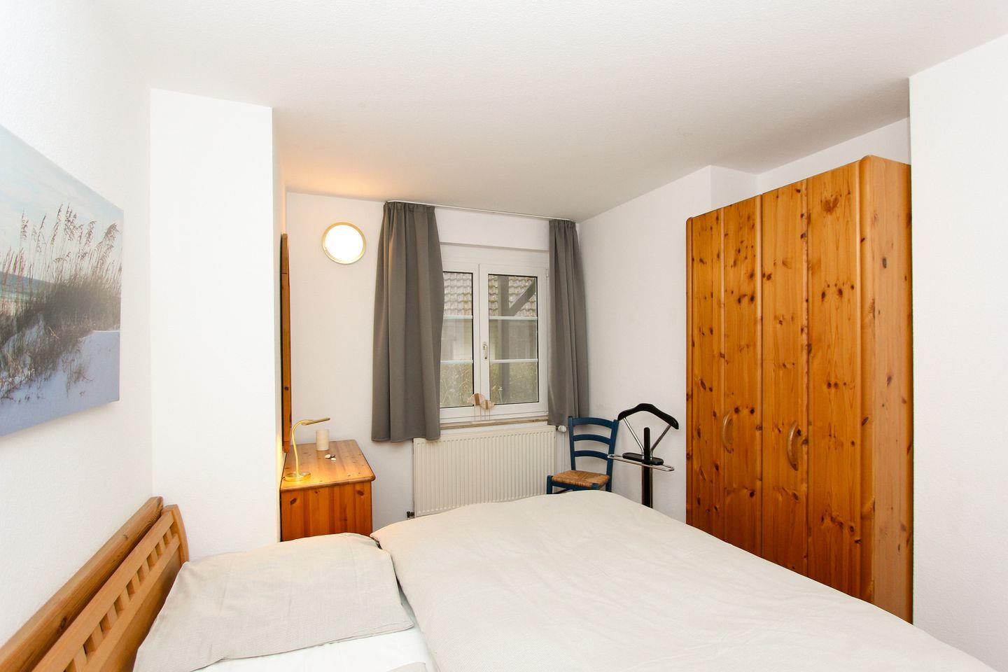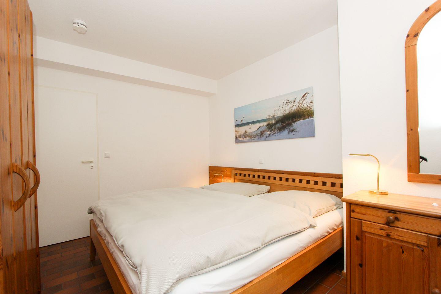 Im hinteren Teil der Wohnung befindet sich rechts das großzügige Schlafzimmer, mit gemütlichem Doppelbett, einem Kleiderschrank, einer Kommode, sowie einem Stuhl. Auf der gegenüberliegenden Seite befinden sich ein Duschbad mit WC und ein separates Gäste-WC. Am Ende des Flures ist ein Abstellraum.