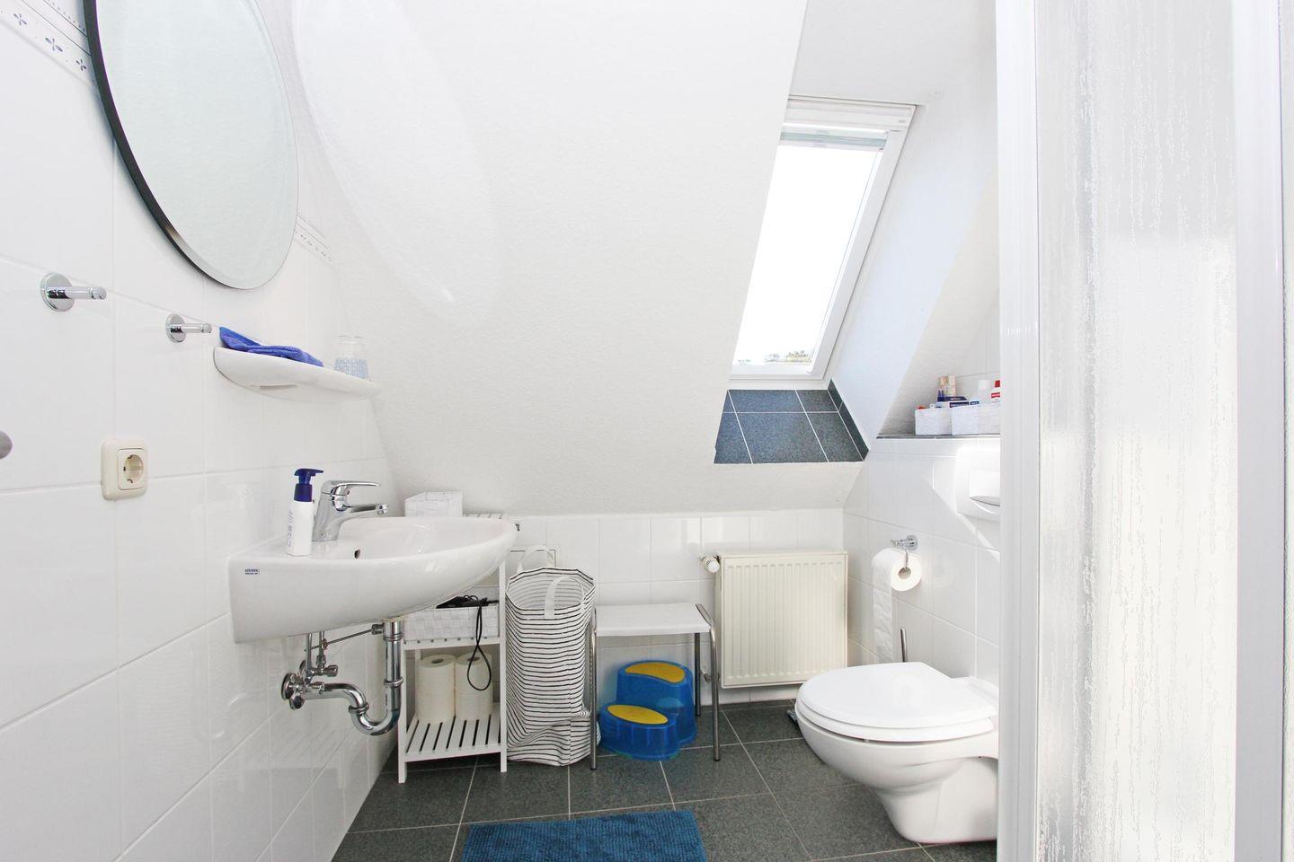 - Bad mit Dusche, Waschbecken und WC.