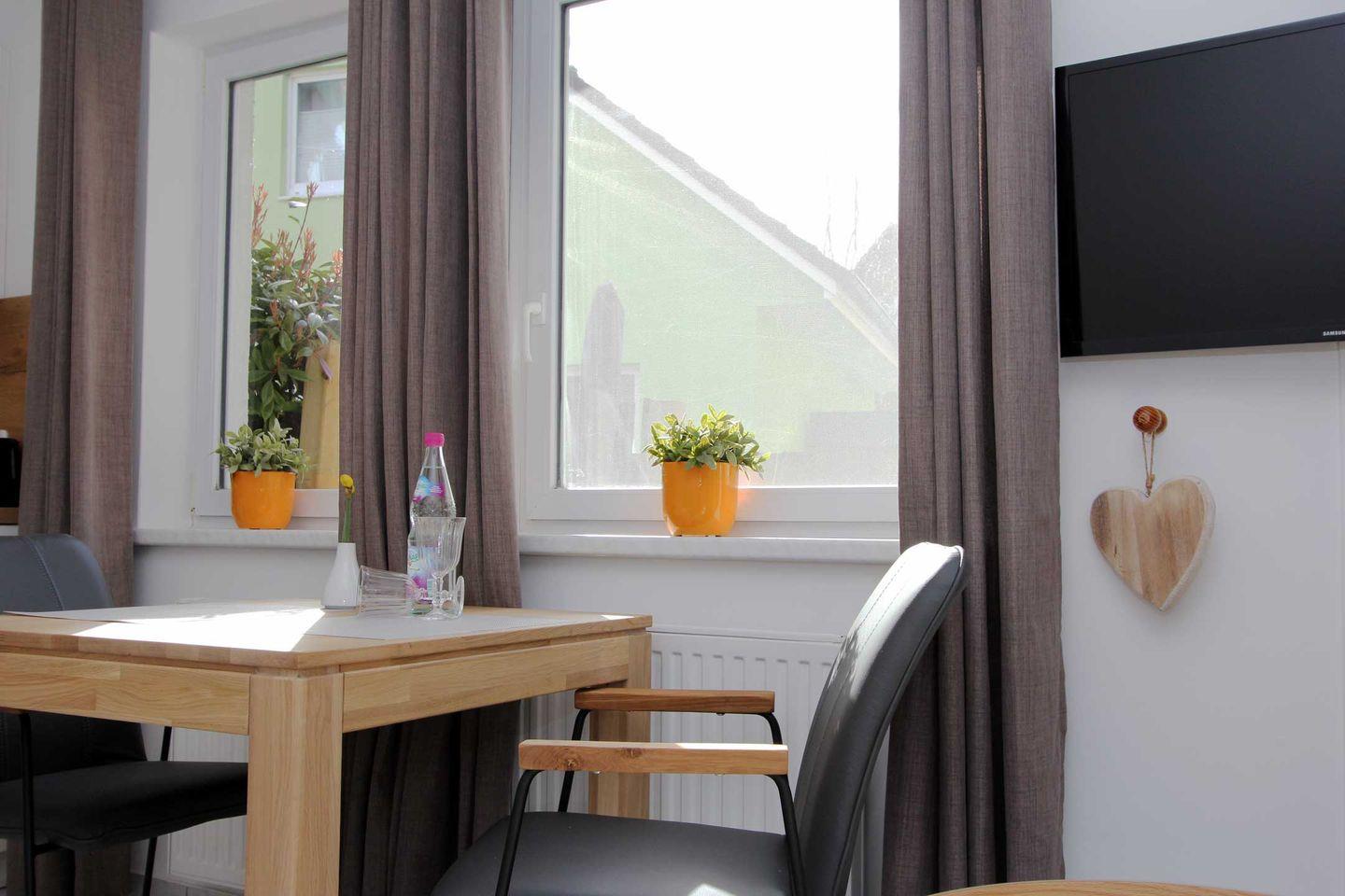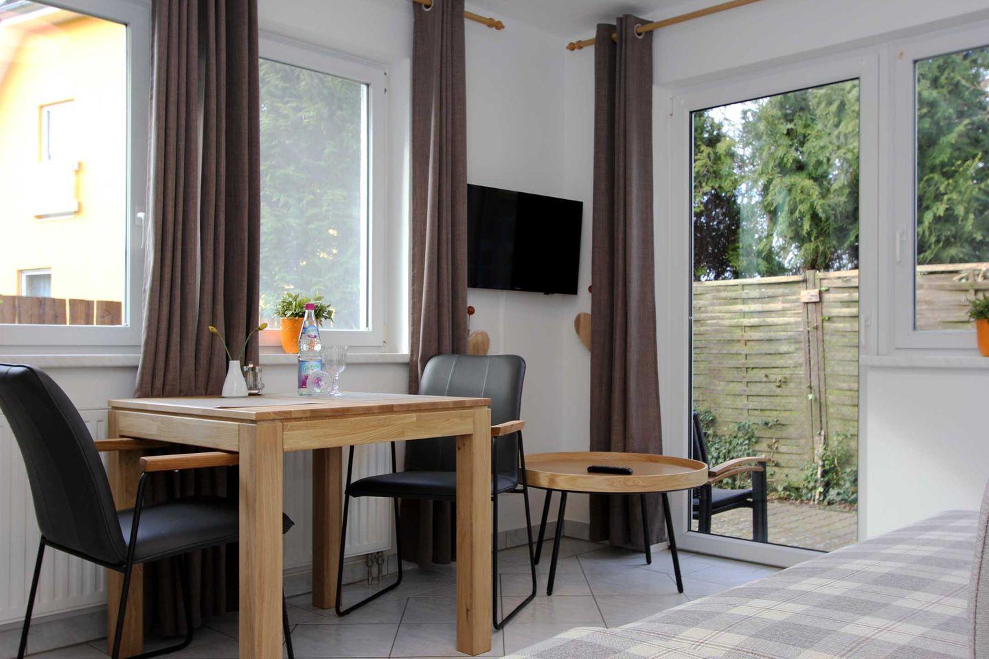 Die Wohnung befindet sich im Erdgeschoss eines Hauses mit insgesamt vier Wohnungen. [nbsp]Im Wohnbereich finden Sie eine gemütliche Couch und Sessel für Ihre Fernsehabende. Das komfortable Schlafzimmer mit großen Fenstern und das helle, geräumige Bad runden die Ferienunterkunft ab. Auf der angrenzenden Terrasse können sie an lauen Sommerabenden den Tag sanft ausklingen lassen.
