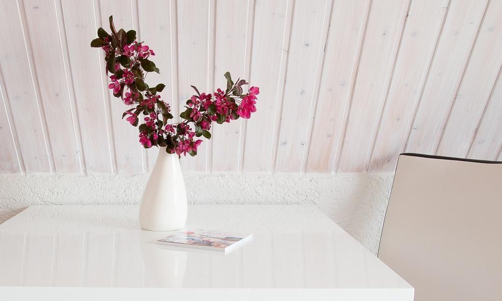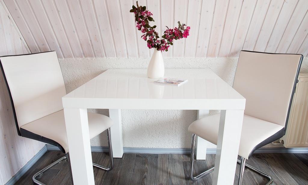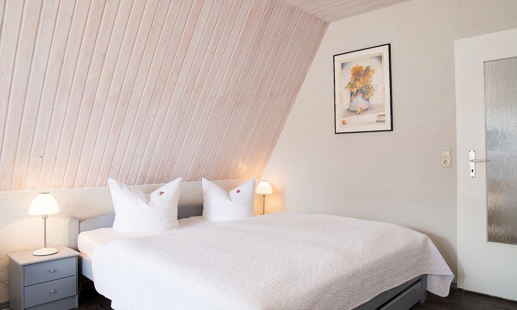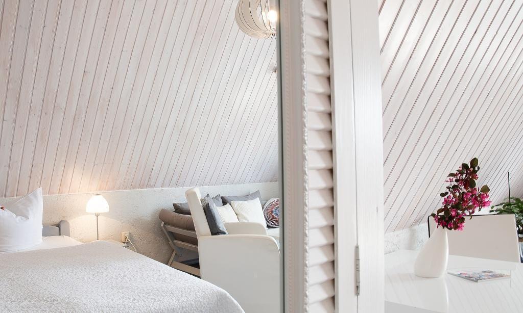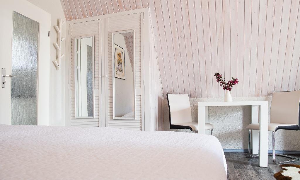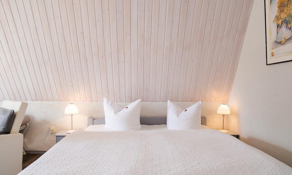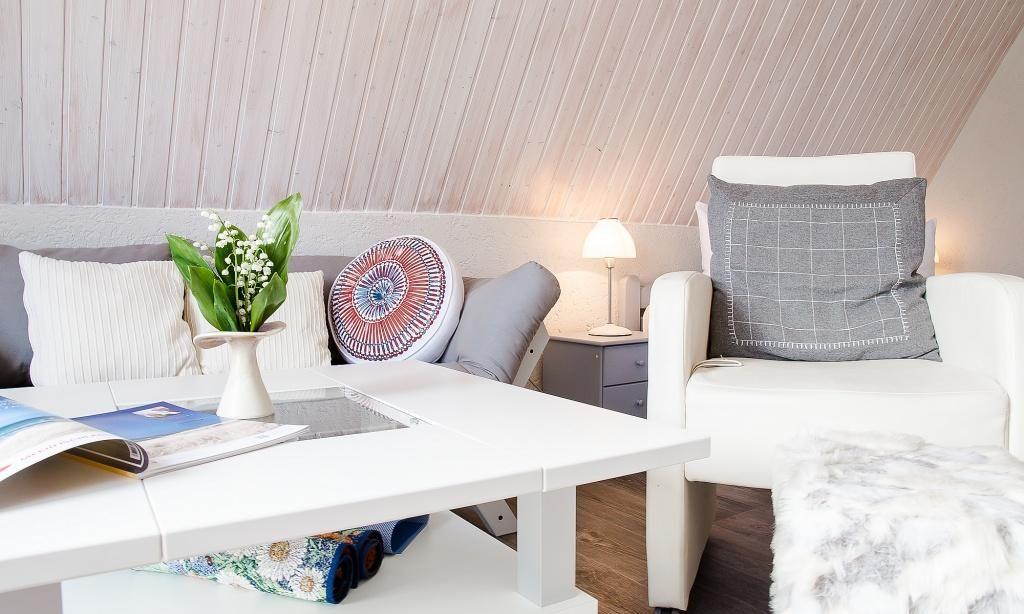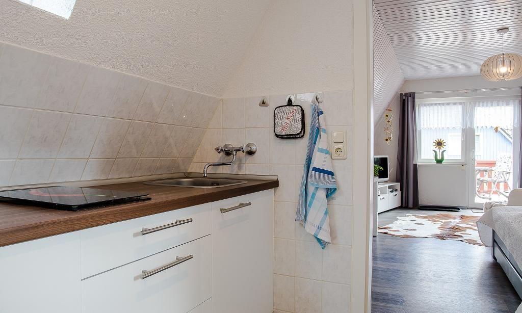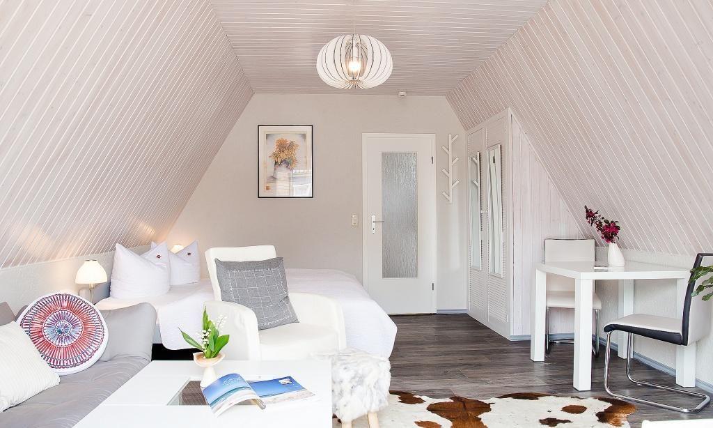 Über eine separate Außentreppe gelangst du in die Wohnung. Es erwartet dich ein modern und sehr gemütlich kombinierter Wohn- und Schlafraum mit hochwertiger Couch und großem Smart-TV. Die holzvertäfelten hellen Wände sorgen für zusätzliche Gemütlichkeit. Ein kleiner Esstisch sowie ein großes Doppelbett fügen sich harmonisch in den Wohnraum ein. Die helle und gut ausgestattete Küchenzeile schließt sich direkt an den Wohnraum an. Das moderne Tageslichtbad ist ebenfalls separat und verfügt über eine Dusche/WC.