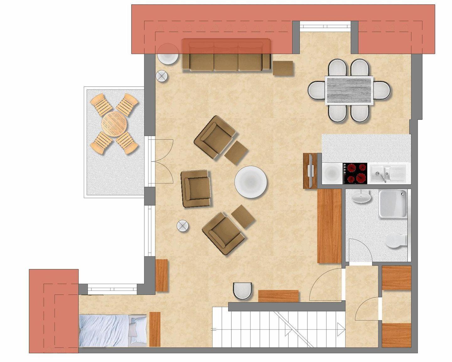 Vom Wohnzimmer aus gelangt man auf den Balkon, der Nachmittags und Abends von der Sonne beschienen ist. Hier lässt es sich ganz entspannt frühstücken oder zu Abend essen. Die gut ausgestattete, moderne Küche und der Esstisch befinden sich angrenzend zum Wohnzimmer. Auf dieser Etage befindet sich auch ein Duschbad mit WC.