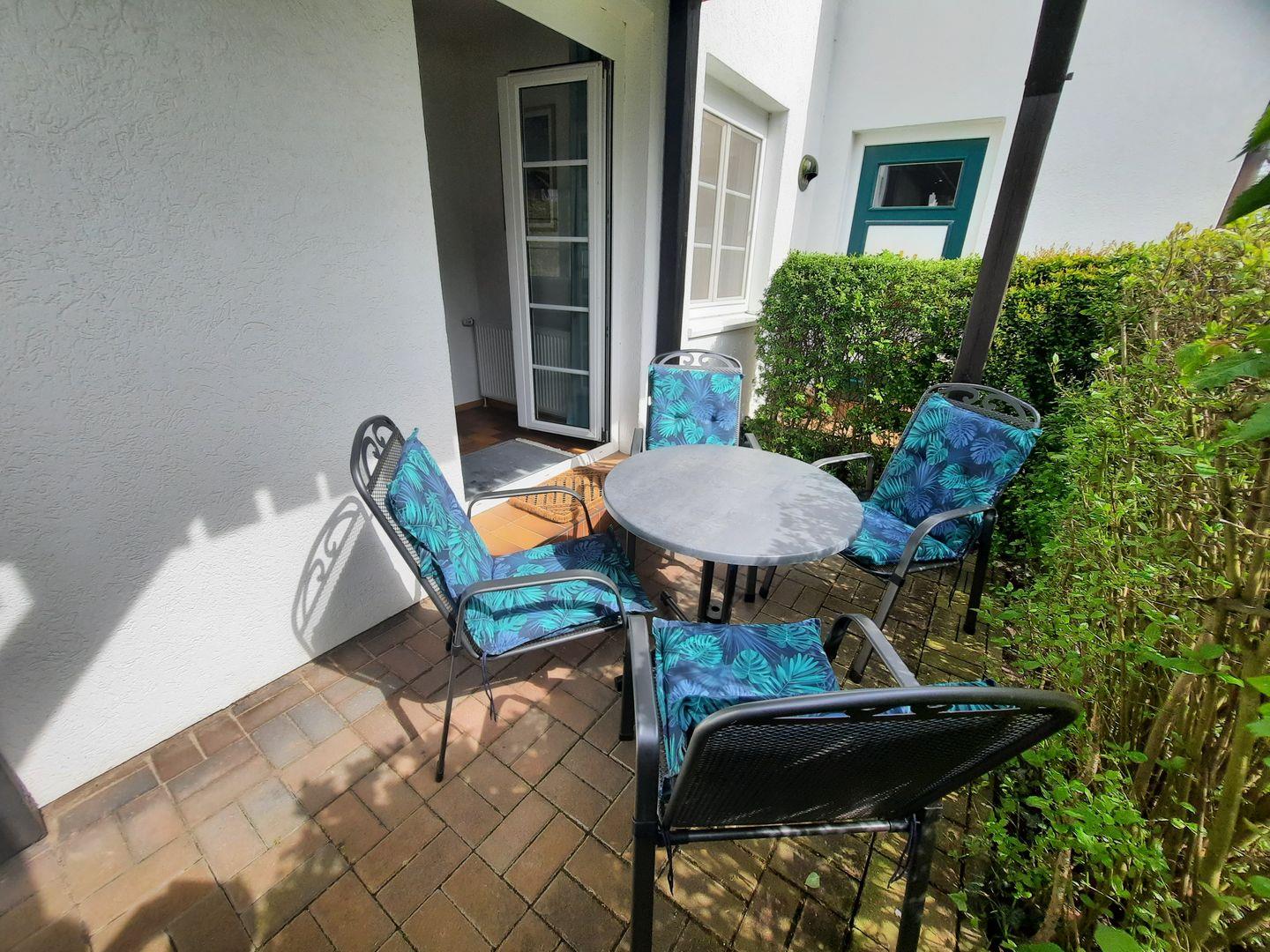 Durch eine ortstypische Darßer Haustür gelangen Sie in das helle Wohnzimmer und den großen Essbereich mit angrenzender komplett ausgestatteter moderner Küche. Im komfortablen Wohnzimmer kann die ausziehbare Fernsehcouch als Schlafmöglichkeit für zwei zusätzliche Personen genutzt werden. Zur weiteren Ausstattung gehören unter anderem zwei Relaxsessel, Fernseher und Stereonanlage und WLAN für Ihre Internetnutzung. Über eine breite Tür im Wohnzimmer betreten Sie die schöne Terrasse auf der Süd-Westseite.