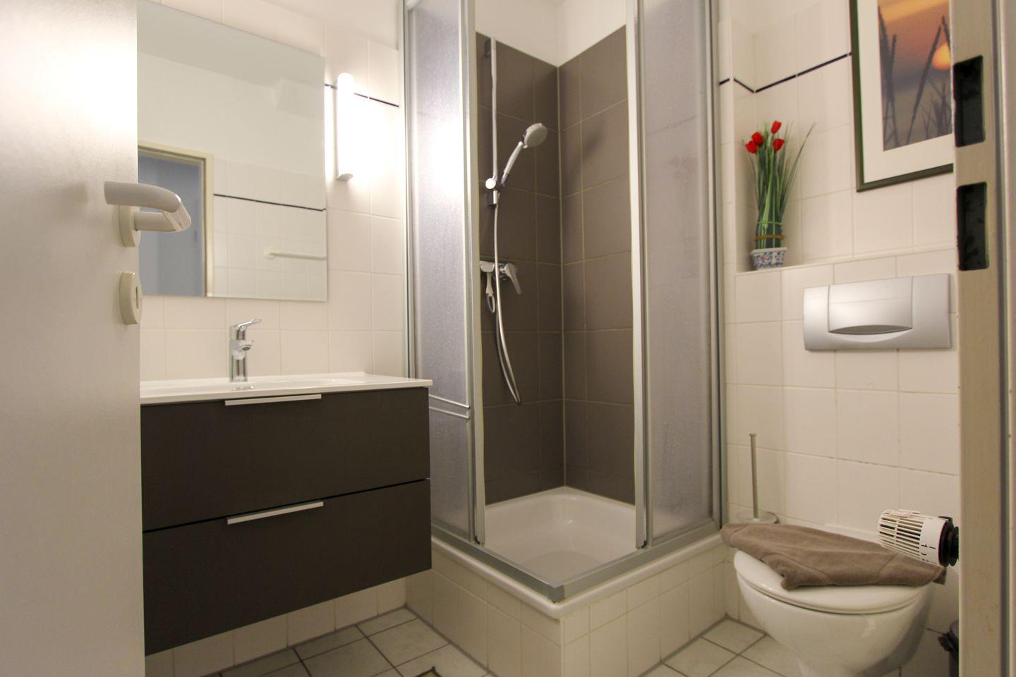 Im hinteren Teil der Wohnung befindet sich rechts das großzügige Schlafzimmer, mit gemütlichem Doppelbett, einem Kleiderschrank, sowie einem Schreibtisch mit Stuhl. Auf der gegenüberliegenden Seite befinden sich ein Duschbad mit WC und ein separates Gäste-WC. Am Ende des Flures ist ein Abstellraum.