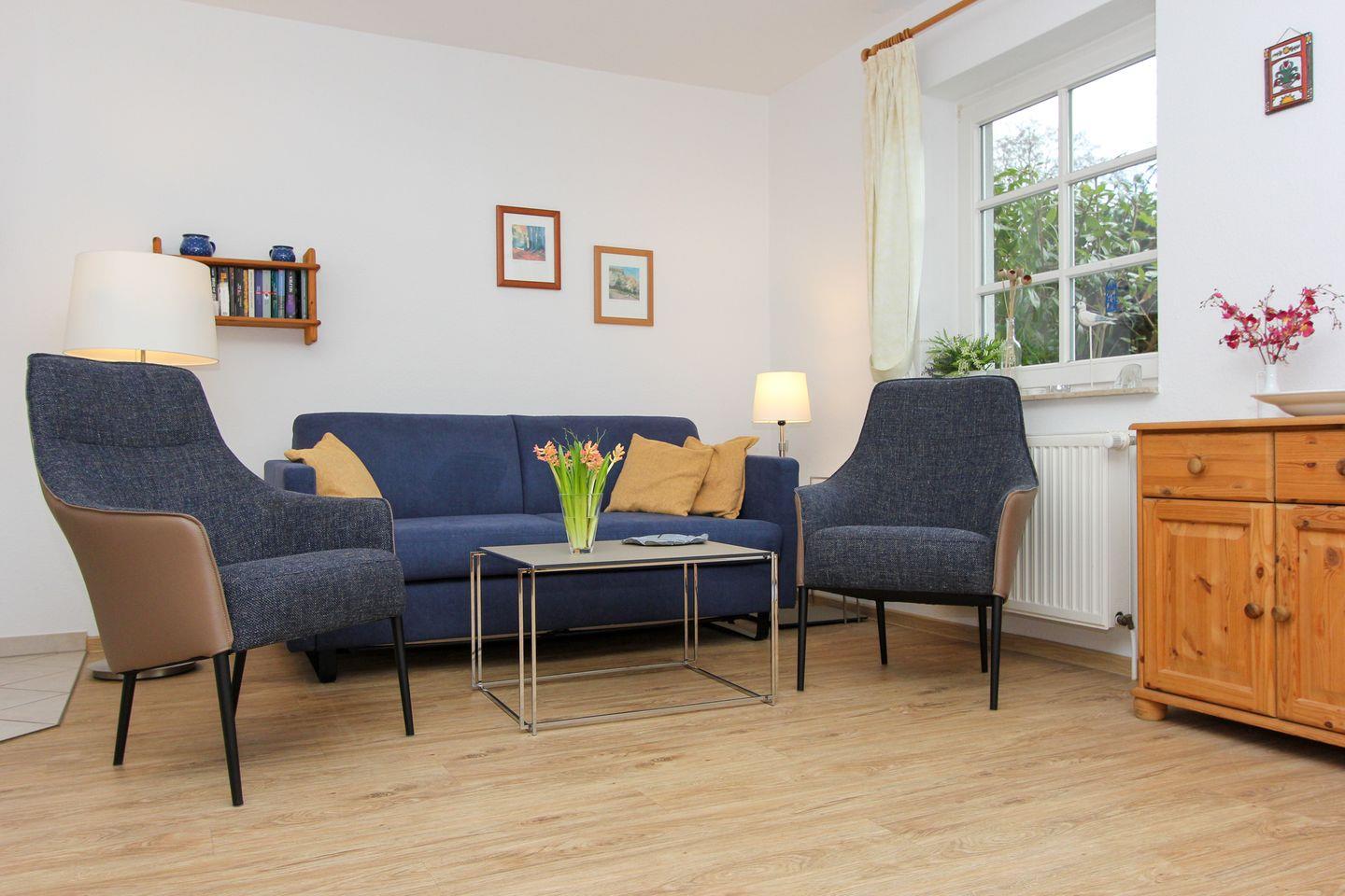 Die Ferienwohnung verfügt über ein gemütliches Schlafzimmer und ein komfortables Wohnzimmer mit Schlafcouch, welches zum Verweilen einlädt. Hier können Sie sich auf dem Sofa entspannen, während das warme Licht des Kamins eine behagliche Atmosphäre schafft.