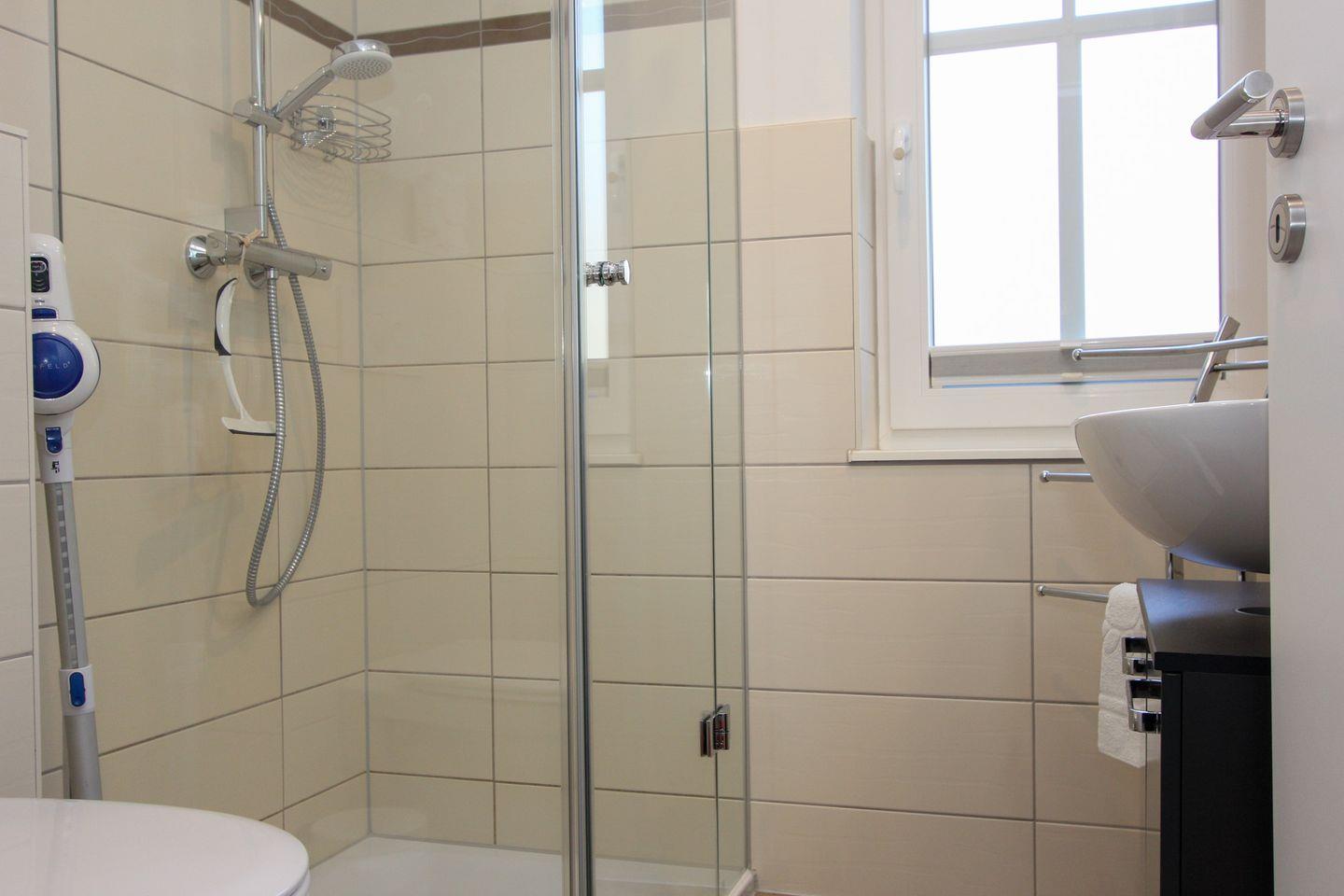 Im Wohn- und Schlafraum befinden sich zwei Massagestühle, ein Boxspringbett, eine kleine, aber gut ausgestattete Küchenzeile und ein Esstisch. Das sehr helle und freundliche Badezimmer mit Dusche und WC schließt sich dem Wohnraum an. Die Wohnung verfügt über eine Fußbodenheizung.