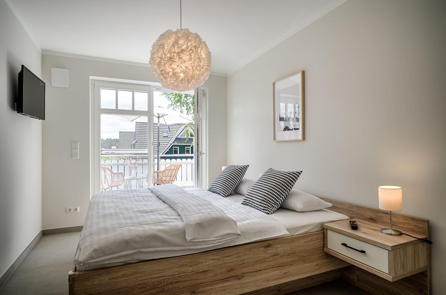 1 Schlafzimmer mit Doppelbett (1,80 x 2,00m), verstellbare Lattenroste, TV, mit Zugang zur Dachterrasse