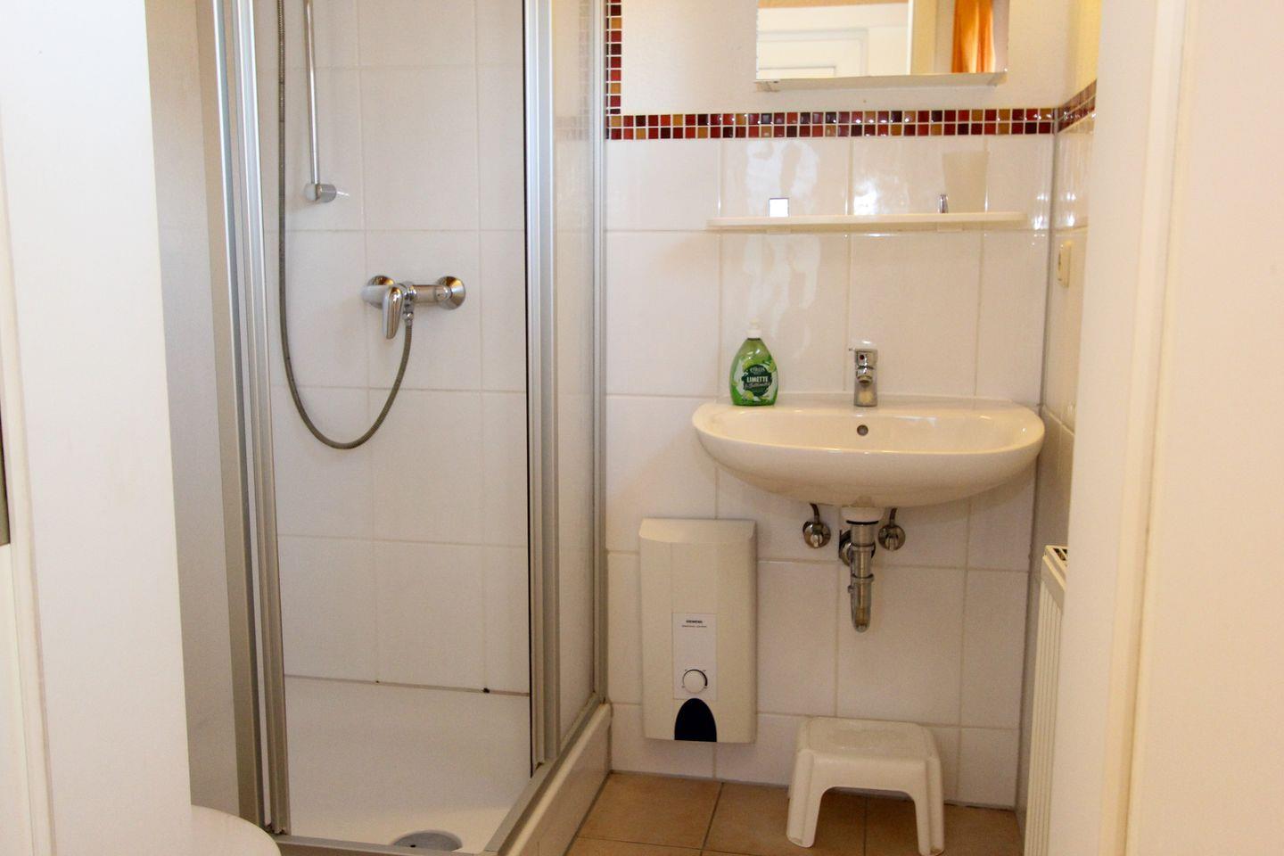 Das Badezimmer mit Dusche und Tageslicht befindet sich auch auf dieser Etage.