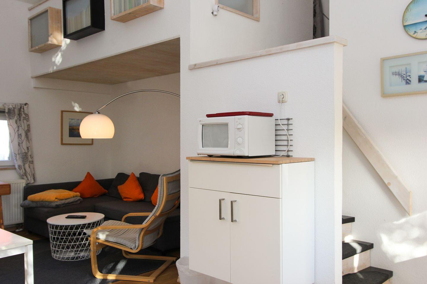 Die helle und einladende Wohnung verfügt über einen Schlafbereich mit Doppelbett auf offener Galerie. Der offene Wohnbereich ist der zentrale Treffpunkt und kombiniert eine Sofaecke mit einem Essbereich, perfekt für gemeinsame Mahlzeiten oder Spieleabende. Hier genießen Sie auch den Zugang zur eigenen Terrasse, die mit Gartenmöbeln ausgestattet ist.