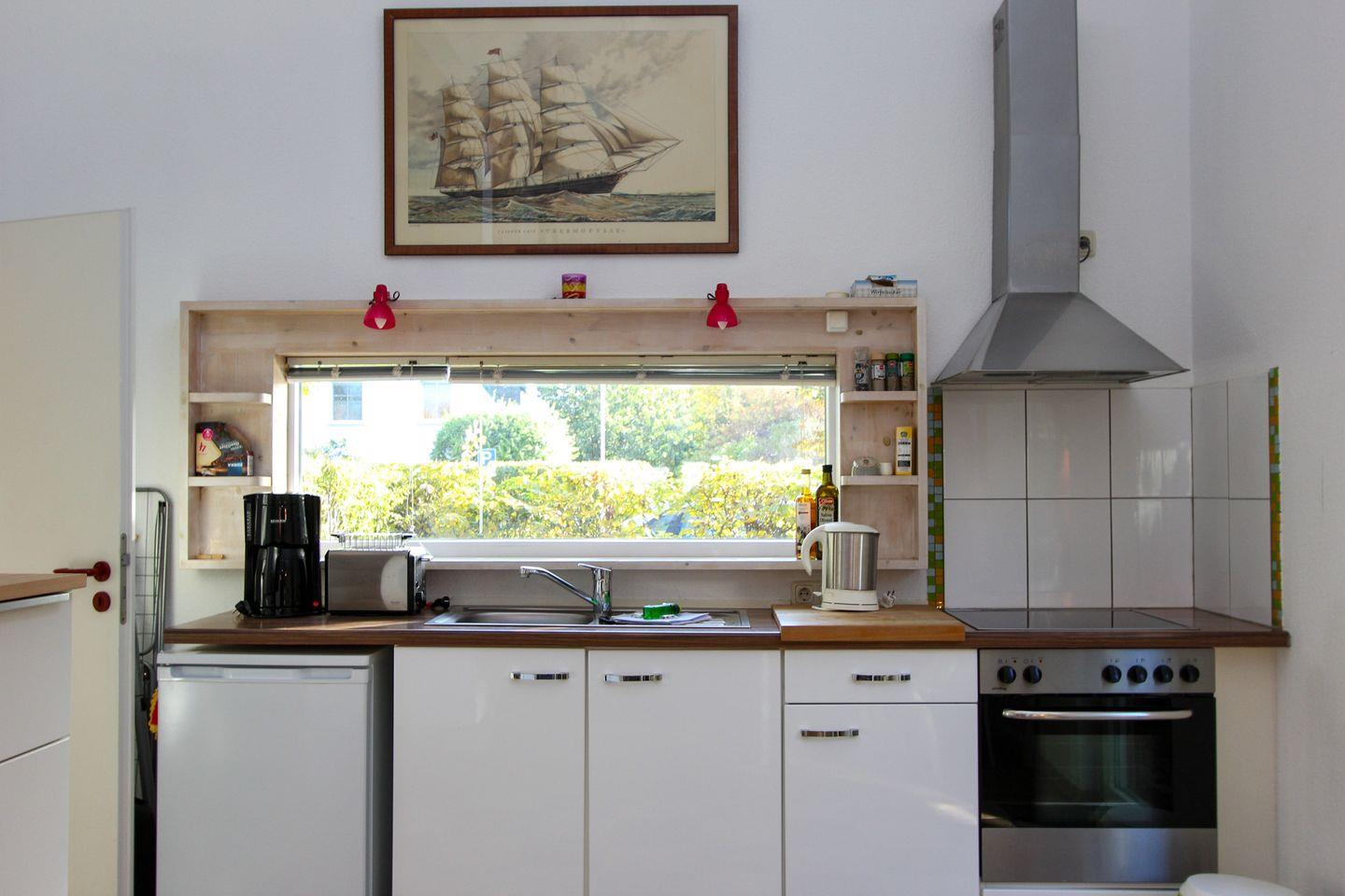 Die offene Küche ist gut ausgestattet und bietet Ihnen alles, was Sie benötigen, um Ihre Lieblingsgerichte zuzubereiten. Zusätzlich verfügt die Ferienwohnung über WLAN. Das Badezimmer mit Dusche und Tageslicht befindet sich auch auf dieser Etage.