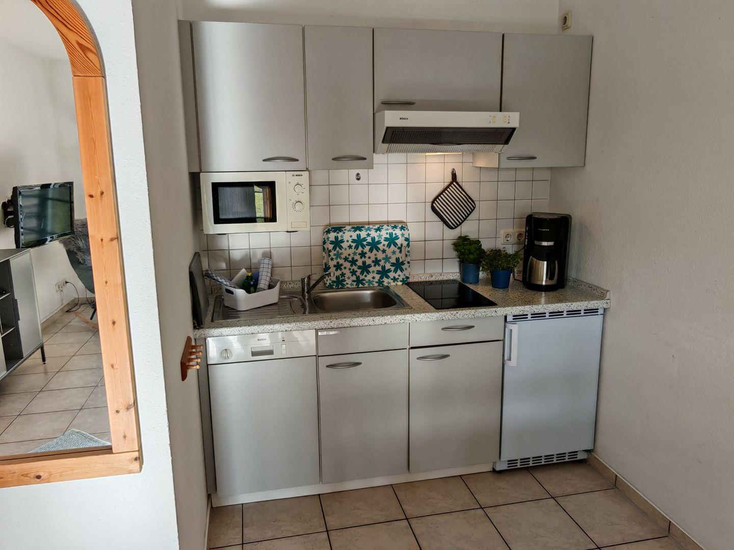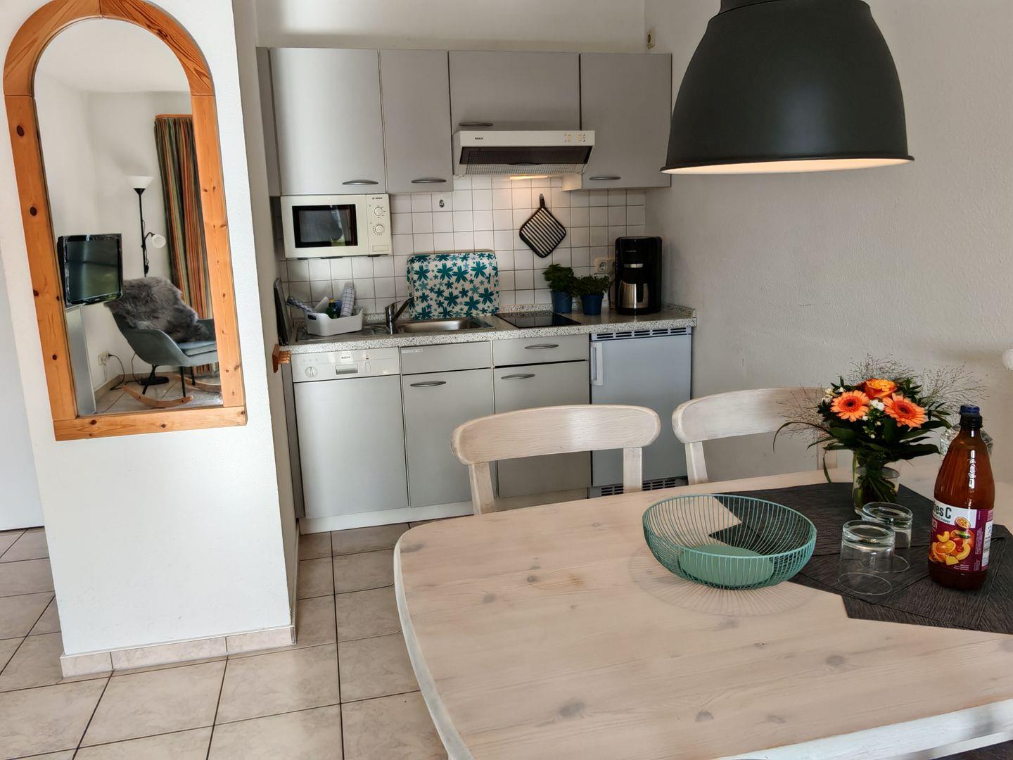 Das Wohnzimmer beherbergt nicht nur ein komfortables Sofa, sondern auch einen bequemen Sessel – der ideale Ort, um sich nach einem erlebnisreichen Tag zu entspannen. Die offene Küche ist komplett ausgestattet und lädt dazu ein, gemeinsam zu kochen und die Mahlzeiten in angenehmer Gesellschaft zu genießen.