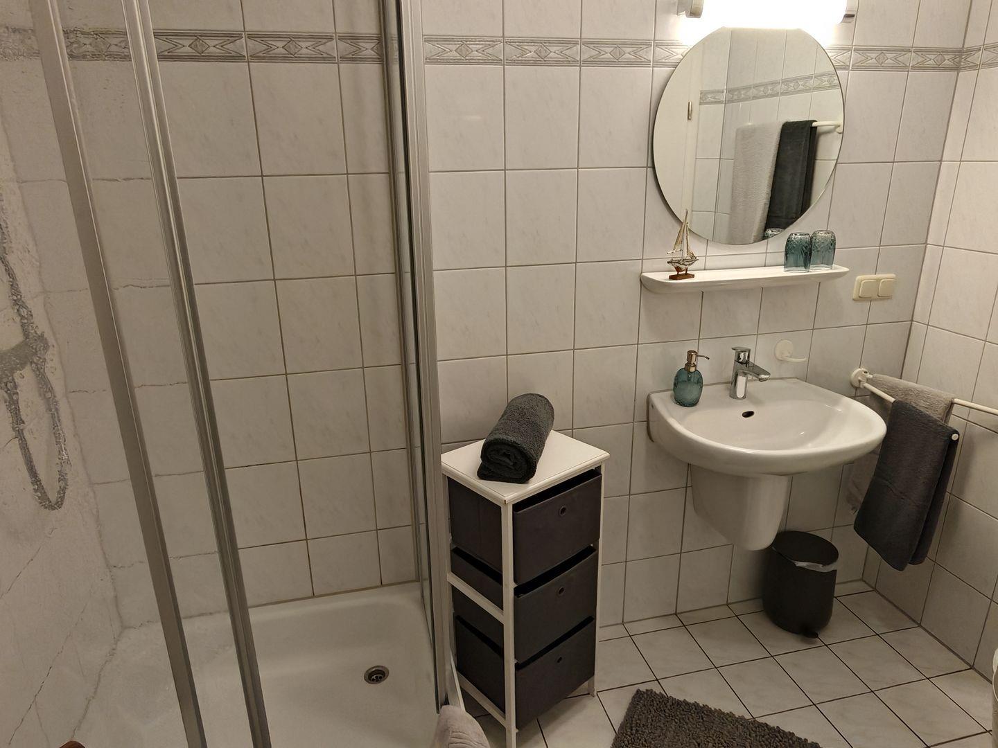 Das separate Schlafzimmer verspricht erholsame Nächte in einem harmonischen Ambiente. Das innenliegende Bad ist durch die hellen Fliesen und der Ausstattung einladend . Eine Besonderheit der Wohnung ist die Terrasse, die sowohl vom Wohnzimmer als auch vom Schlafzimmer aus erreichbar ist. Genießen Sie hier unvergessliche Momente mit einem unverbauten Blick auf die grüne Wiese – ein perfekter Ort für Ihr morgendliches Frühstück oder einen abendlichen Drink.