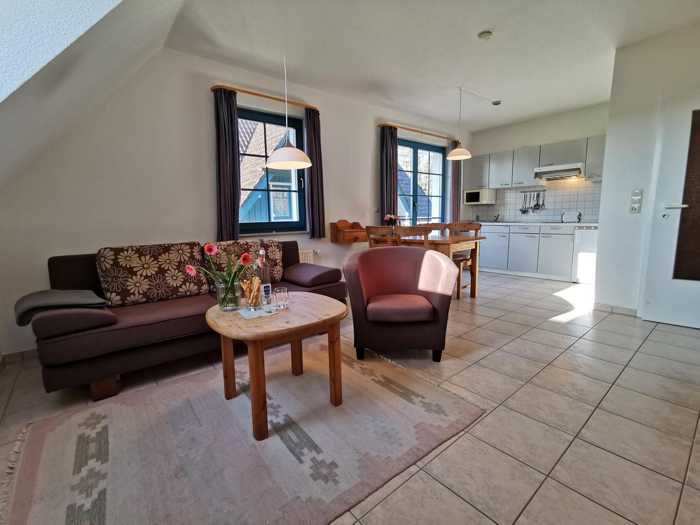Das Sofa sowie der Sessel bieten einen perfekten Ort zum Lesen oder Entspannen. Die geschmackvolle Einrichtung und die durchdachte Raumaufteilung machen diese Ferienwohnung zu einem idyllischen Rückzugsort.