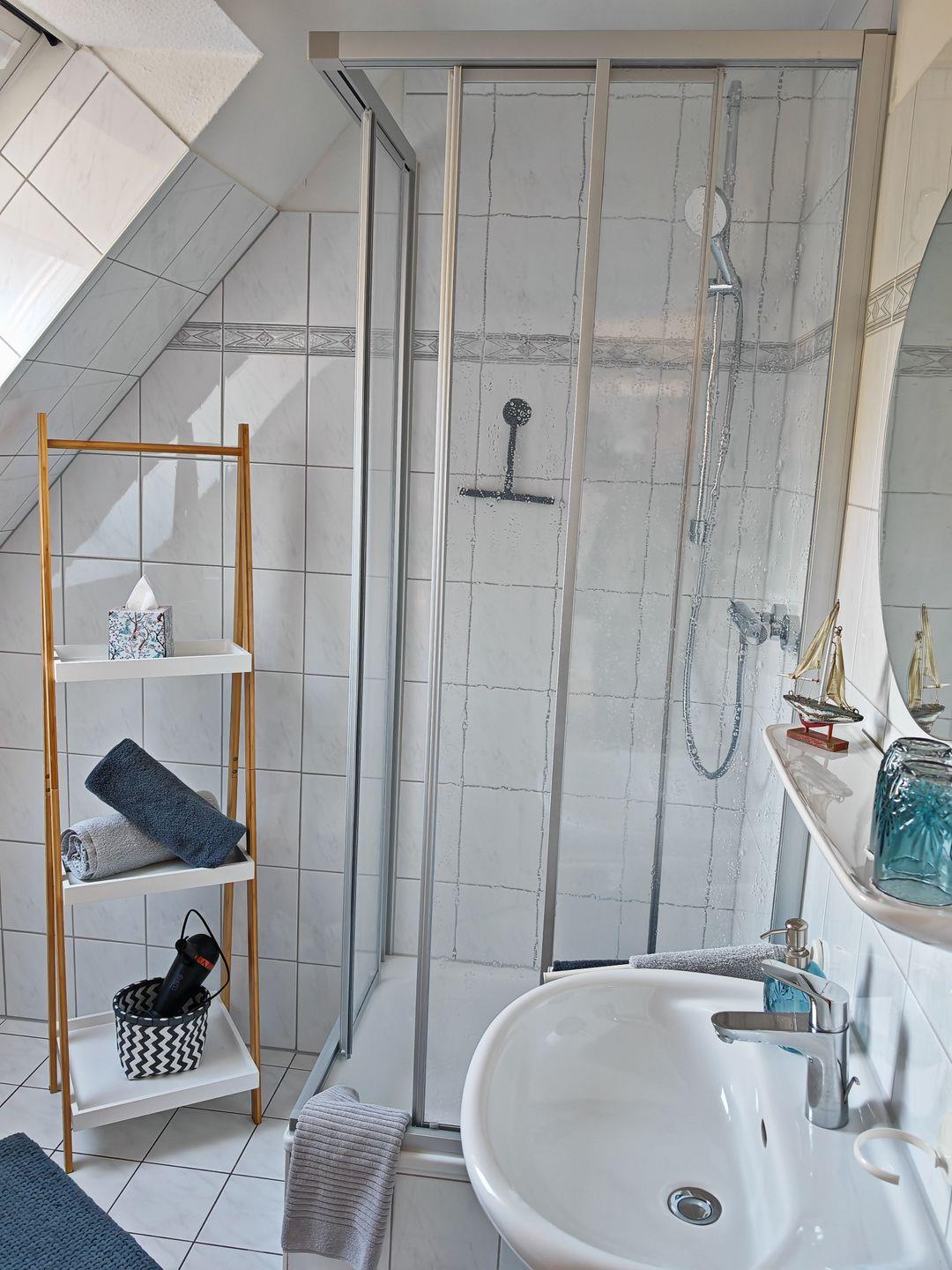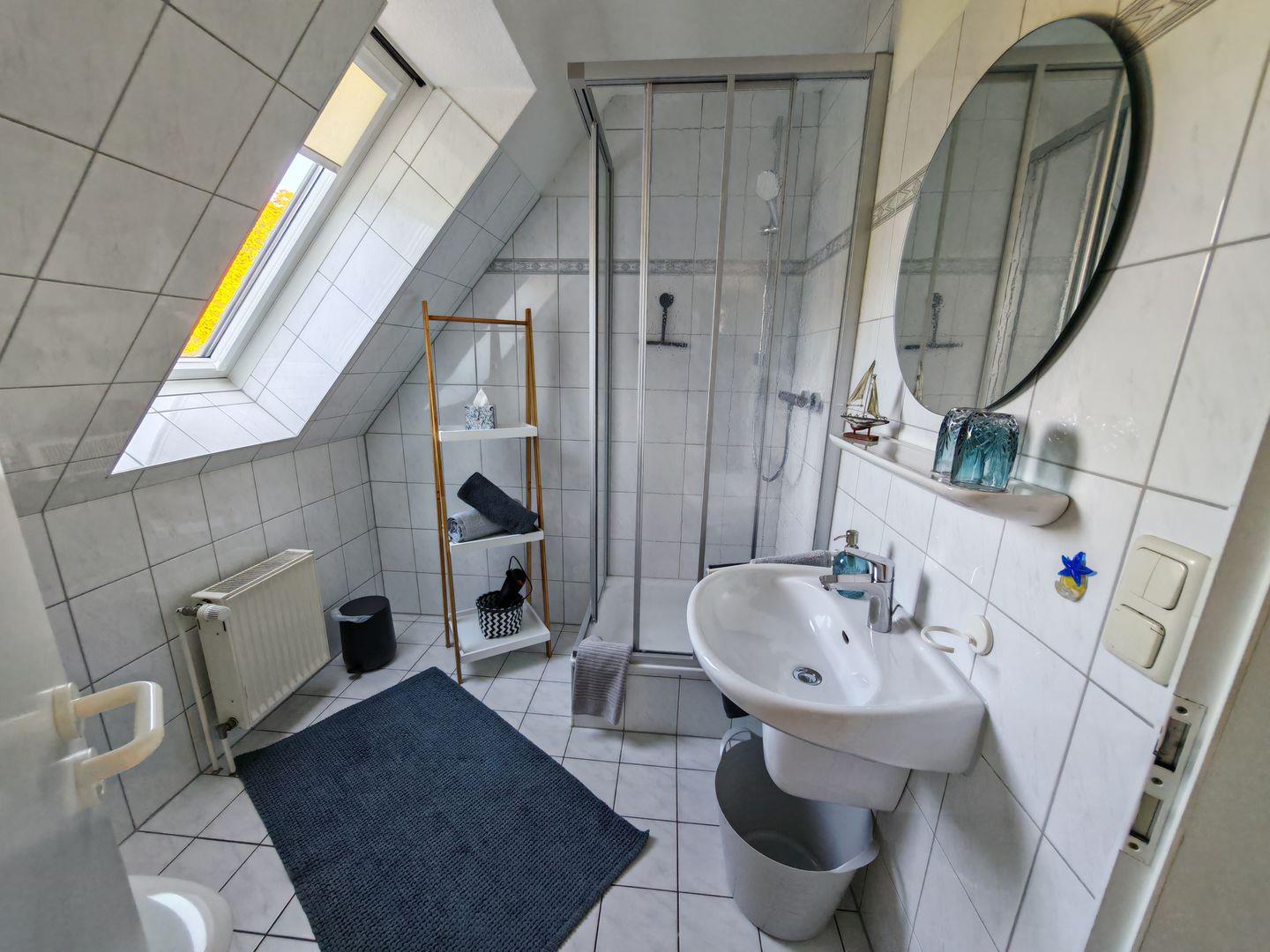 Das Tageslichtbad verleiht der Wohnung eine helle und einladende Atmosphäre. Hier können Sie sich in aller Ruhe frisch machen und auf einen erlebnisreichen Tag vorbereiten.
