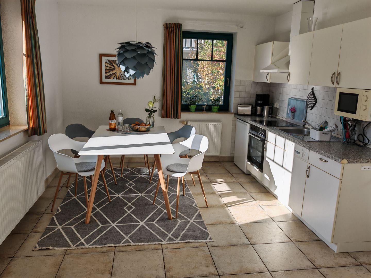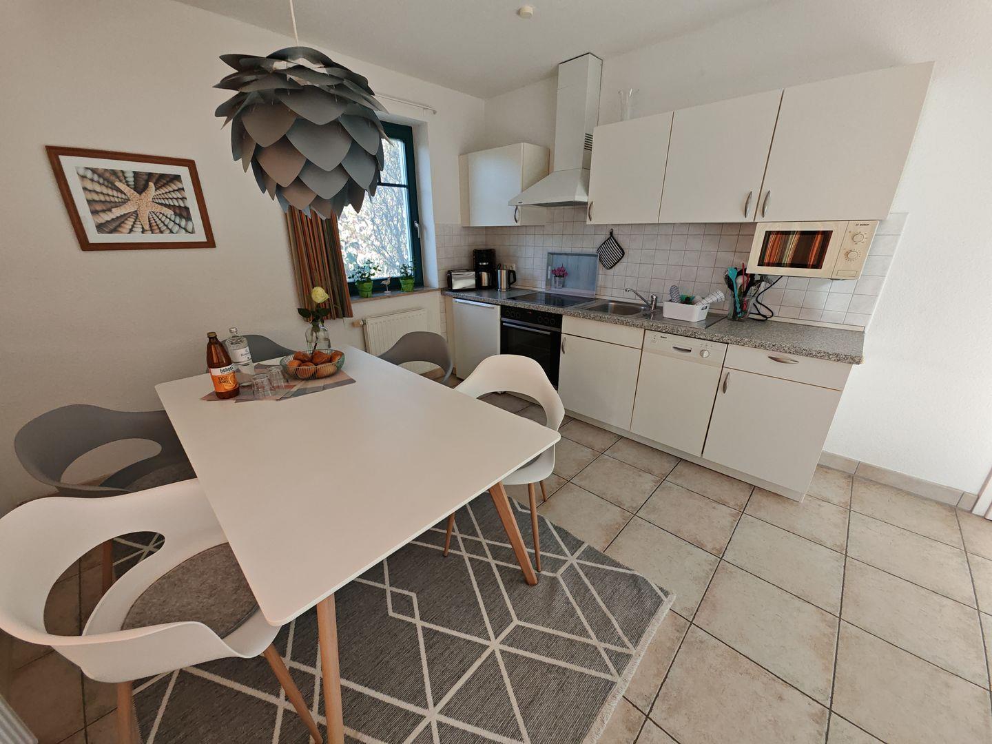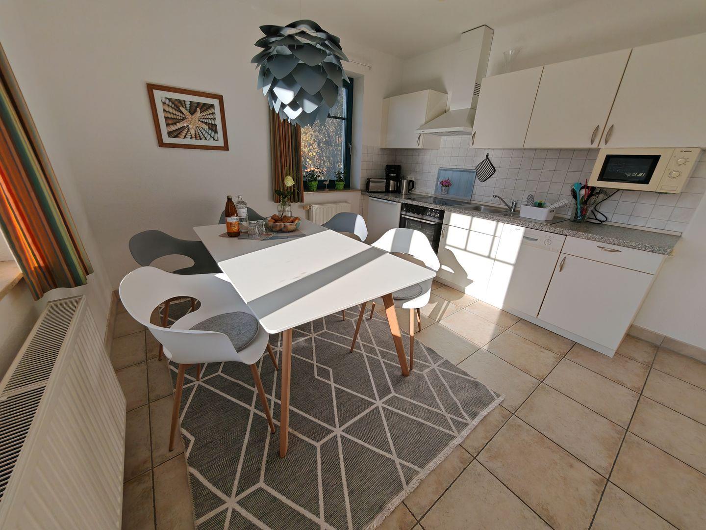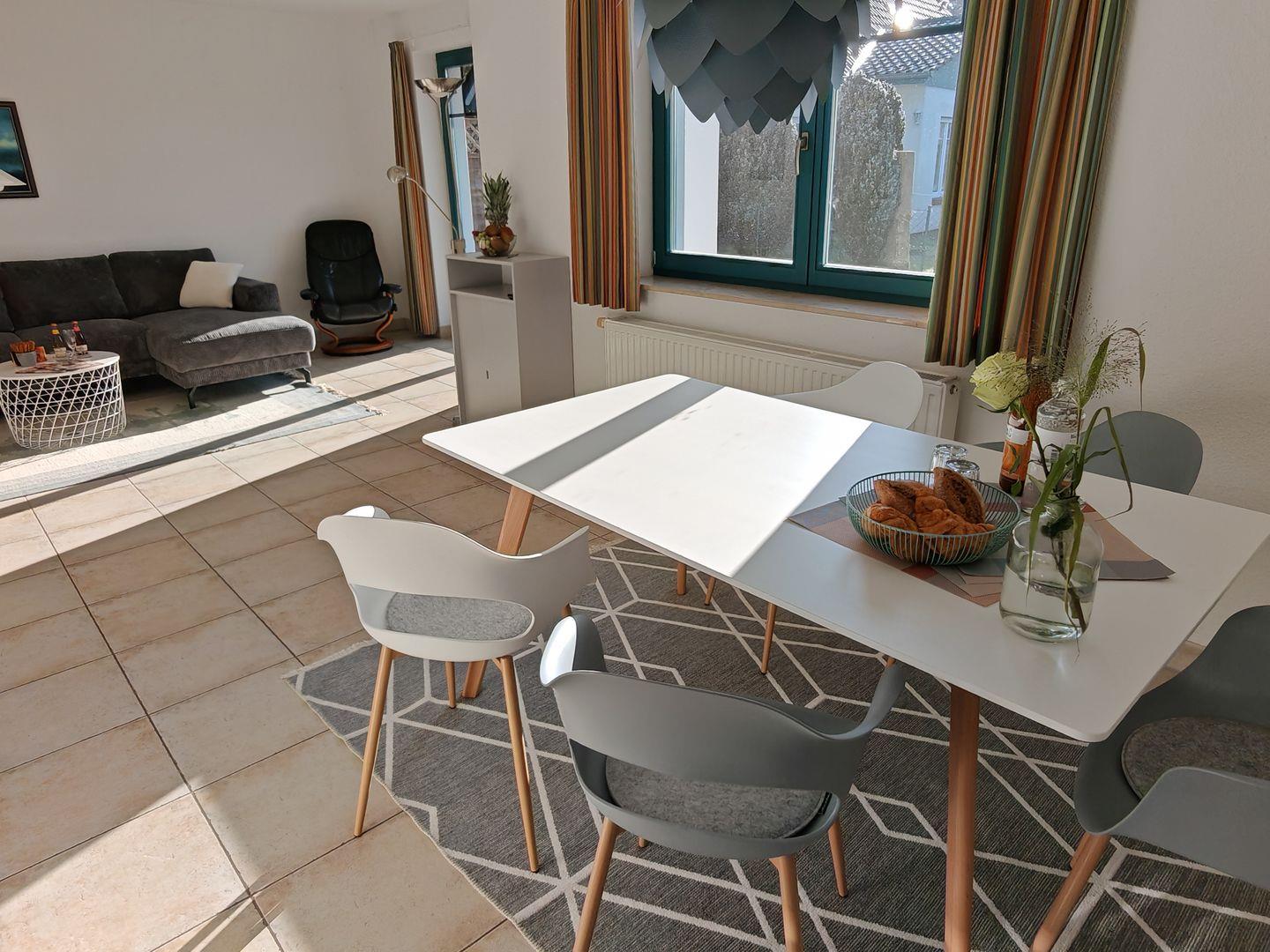 Willkommen in unserer 3-Zimmer-Ferienwohnung (ehemals "Morten") mit 56 qm. Das große Schlafzimmer und das Zimmer mit Tagesbett bieten erholsamen Schlafkomfort. Das Tageslichtbad verspricht Frische und Wohlbefinden. In der offenen Küche finden Sie moderne Annehmlichkeiten und am großen Esstisch Platz für gesellige Mahlzeiten. Die Südterrasse mit Blick auf die Wiese lädt zu entspannten Momenten ein. Genießen Sie den Wohnbereich mit Sofa, Sessel und TV. – der ideal Rückzugsort um sich wohlzufühlen.