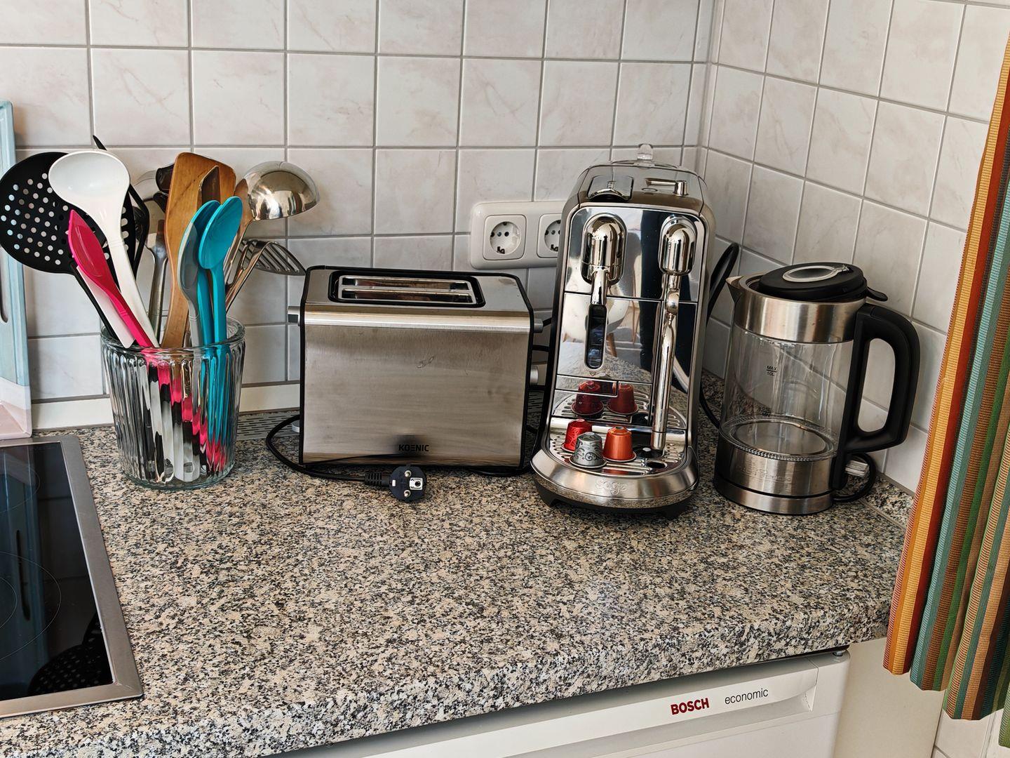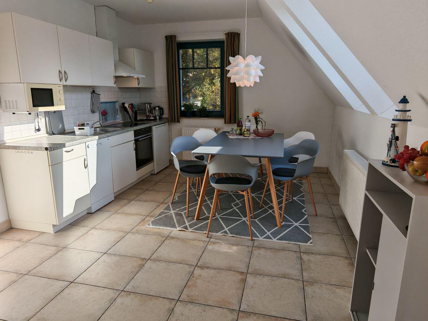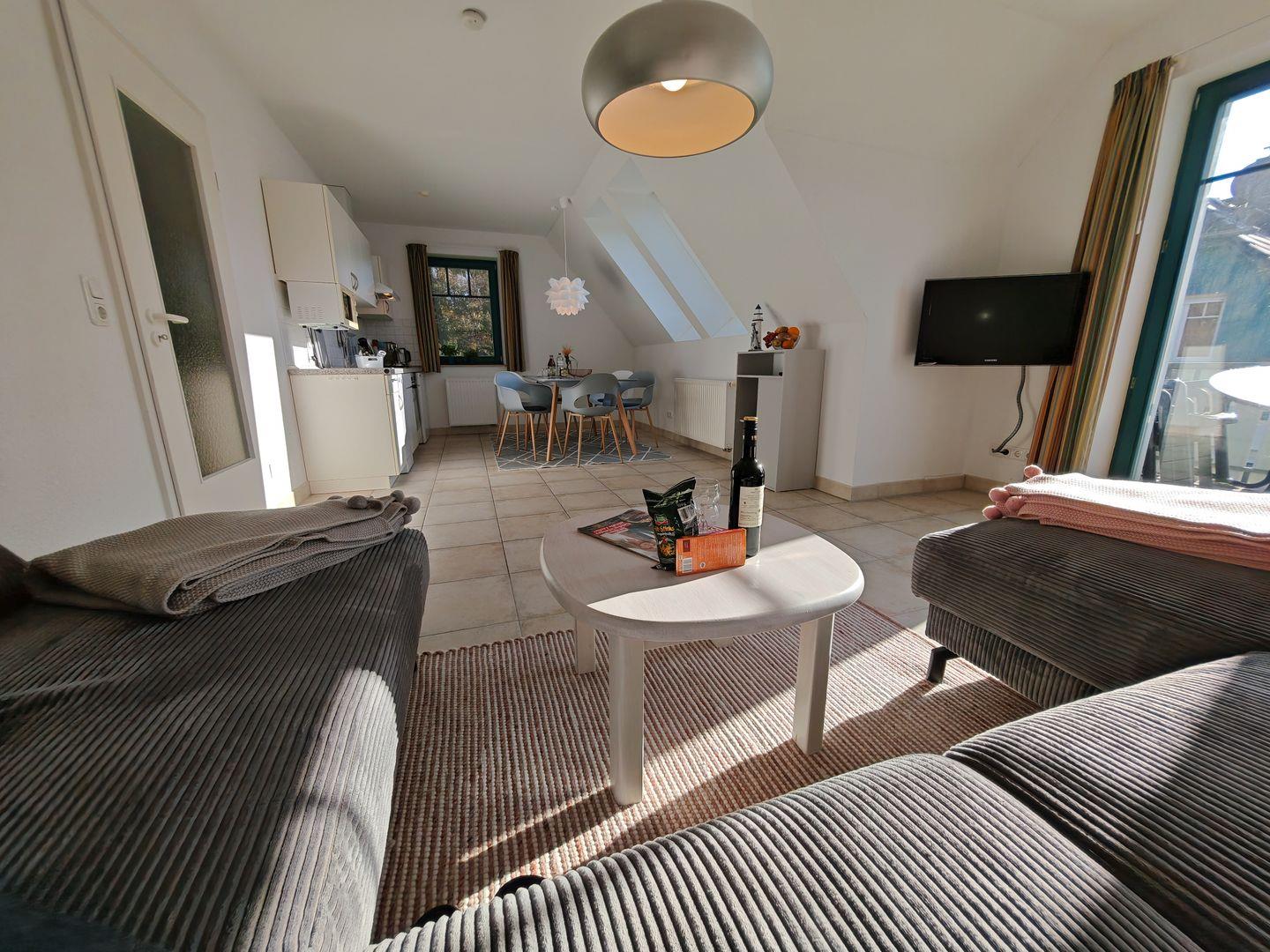 Die offene Küche ist modern und komplett ausgestattet, um Ihren kulinarischen Vorlieben gerecht zu werden. Die schöne Essecke bietet einen einladenden Raum für gemeinsame Mahlzeiten und geselliges Beisammensein. Der Wohnbereich ist mit einem komfortablen Sofa, einem Sessel und einem Flachbild-TV ausgestattet, um Ihnen entspannte Stunden zu ermöglichen.