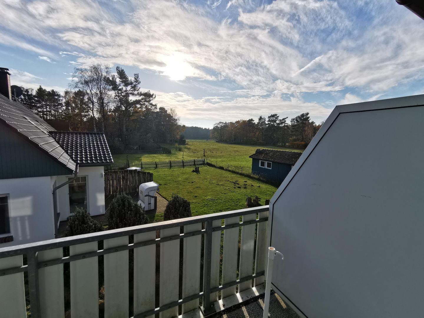 Der Südbalkon eröffnet einen malerischen Blick auf eine grüne Wiese und den umliegenden Wald. Hier können Sie bei einem Glas Wein die Natur genießen oder den Tag mit einer Tasse Kaffee in der Sonne beginnen.