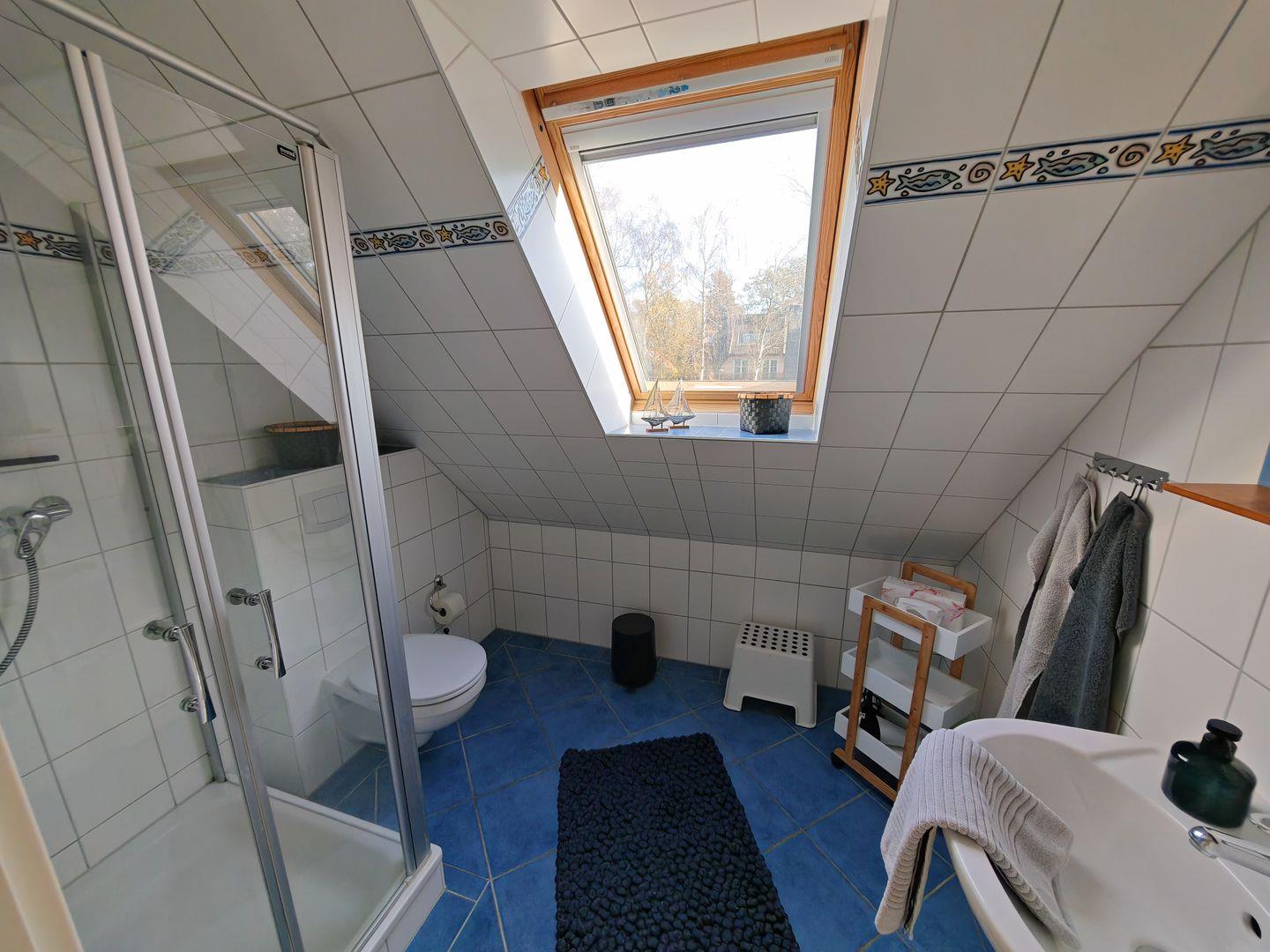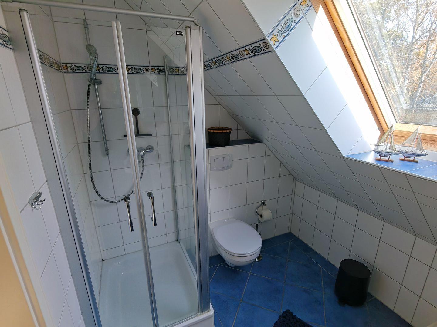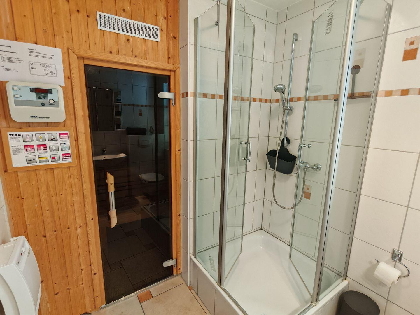 Im Erdgeschoss befindet sich auch das erste Duschbad, das mit einer Sauna ausgestattet ist. Hier können Sie nach einem aktiven Tag in der Natur entspannen und zur Ruhe kommen.