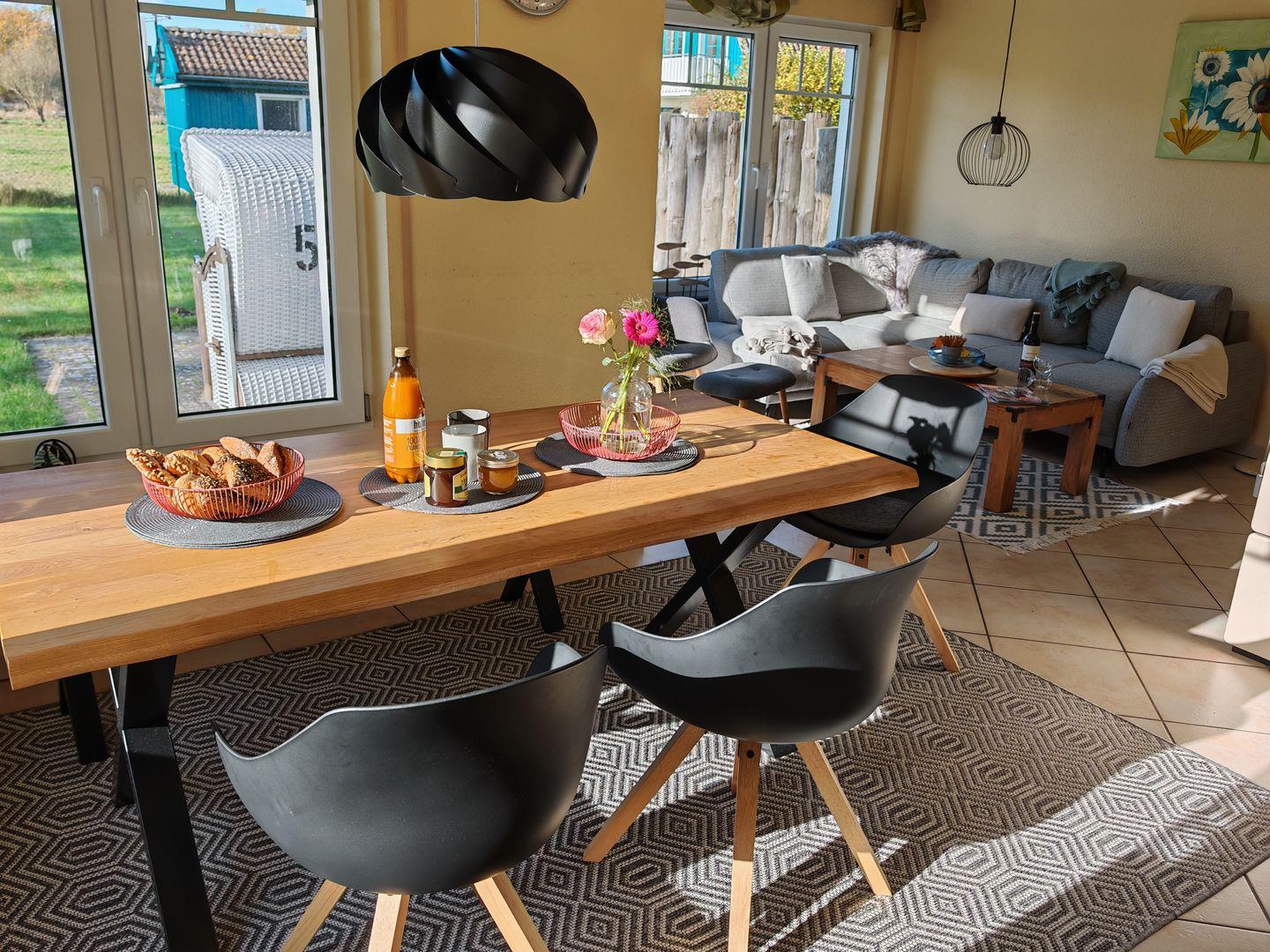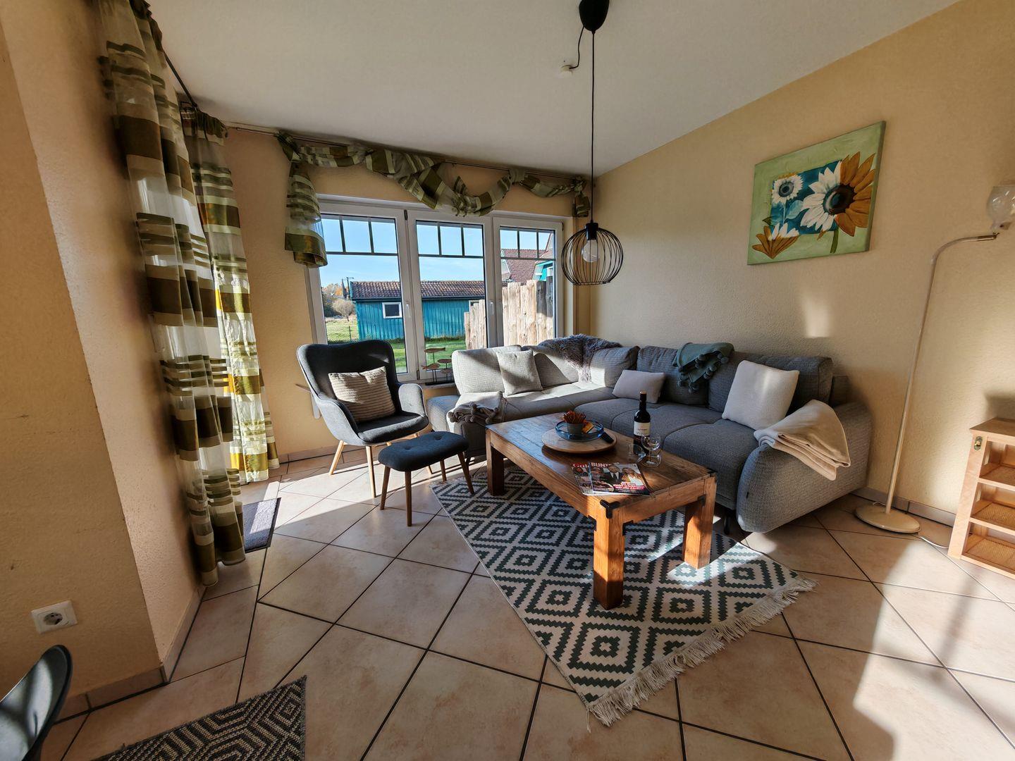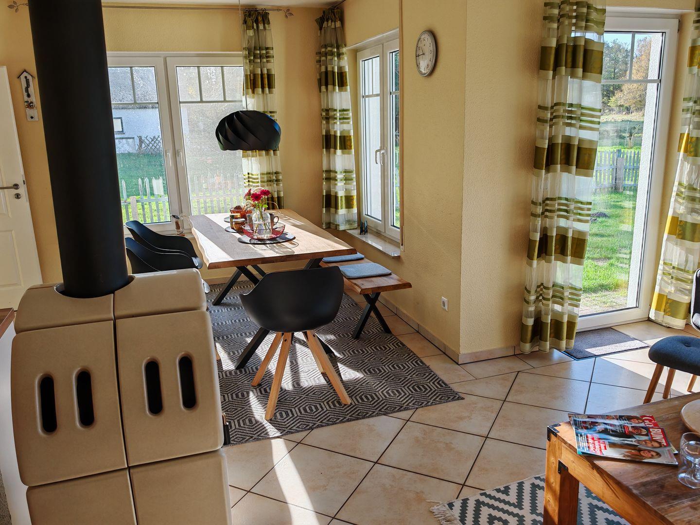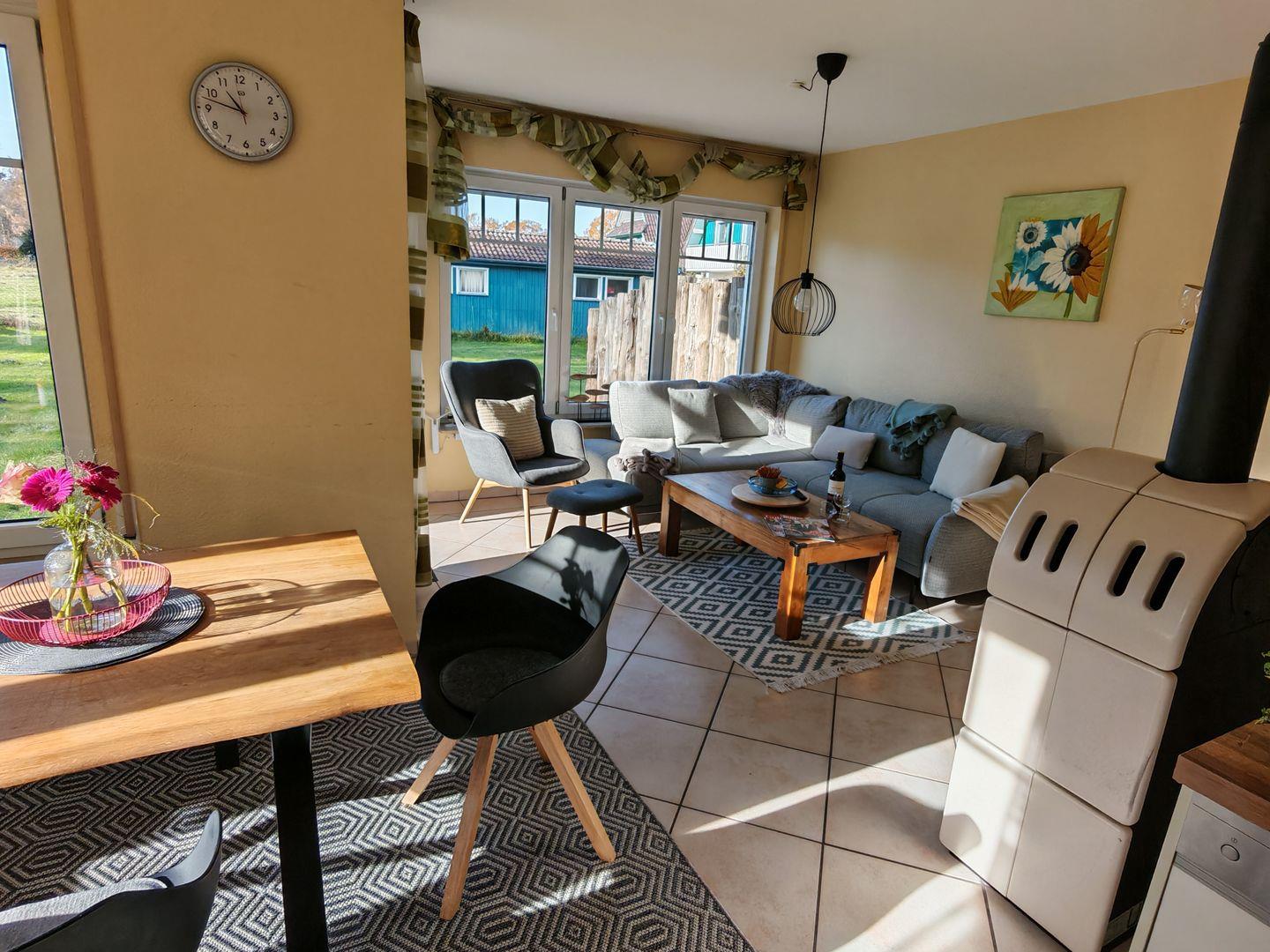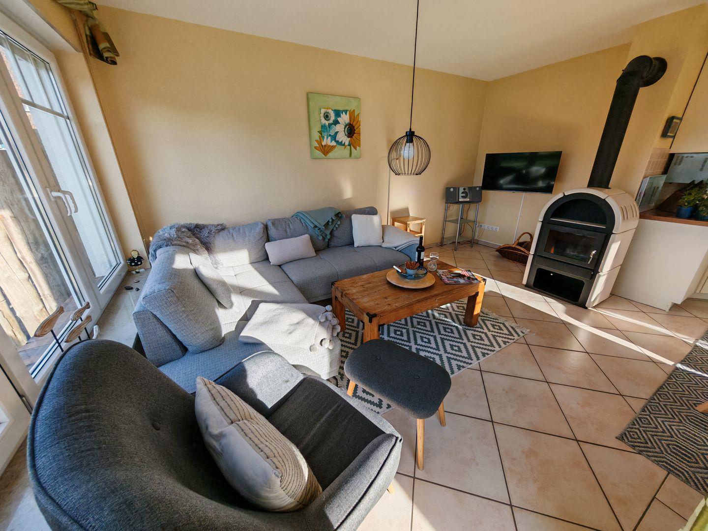Im Erdgeschoss erwartet Sie ein großzügiger Wohnbereich mit einer offenen Küche, einem komfortablen Sofa und einem einladenden Kaminofen. Die offene Küche ist vollständig ausgestattet und bietet alles, was Sie für gemeinsame Kochabende benötigen. Der Kaminofen sorgt nicht nur für wohlige Wärme, sondern auch für eine gemütliche Atmosphäre an kühleren Abenden.