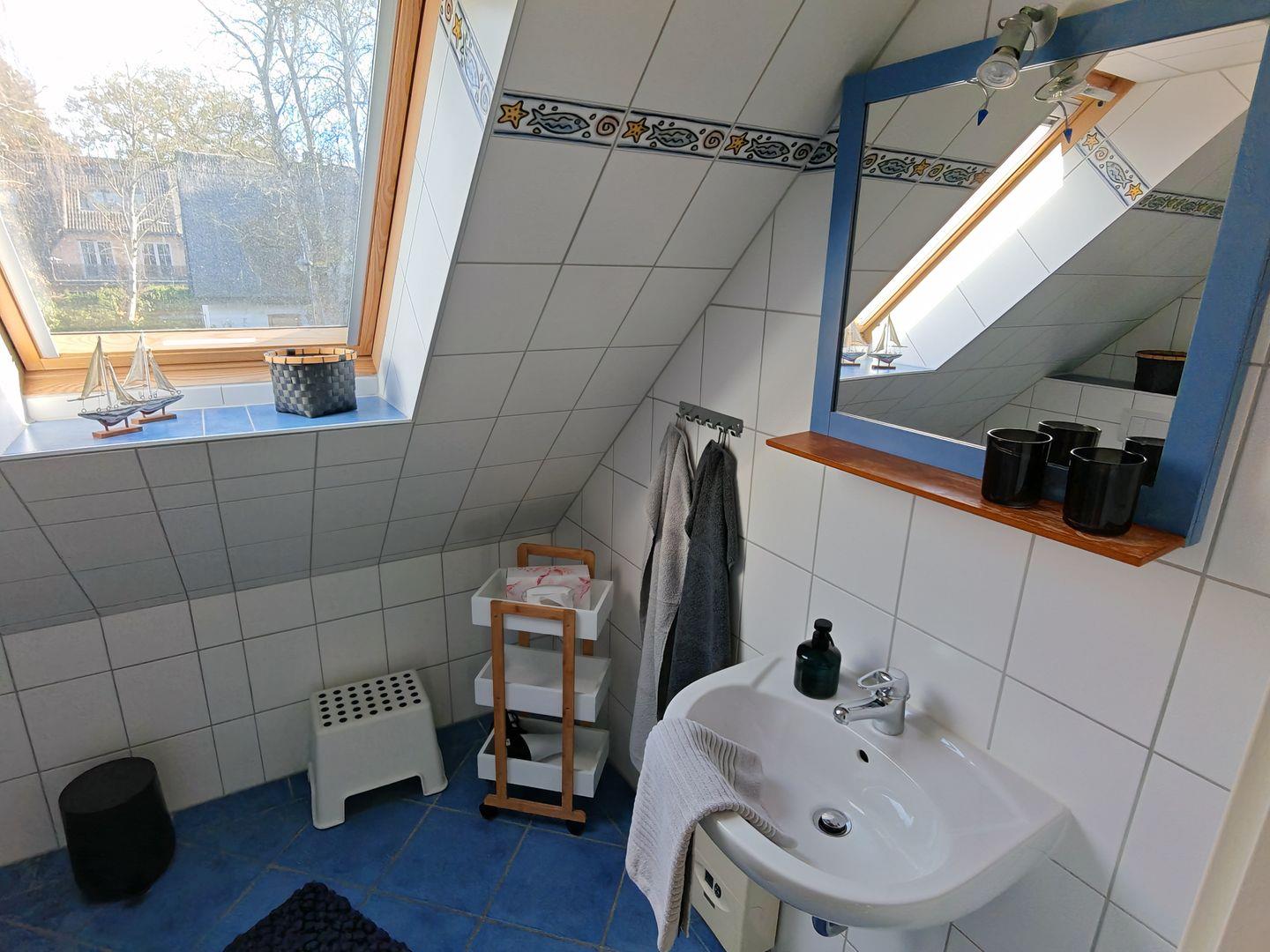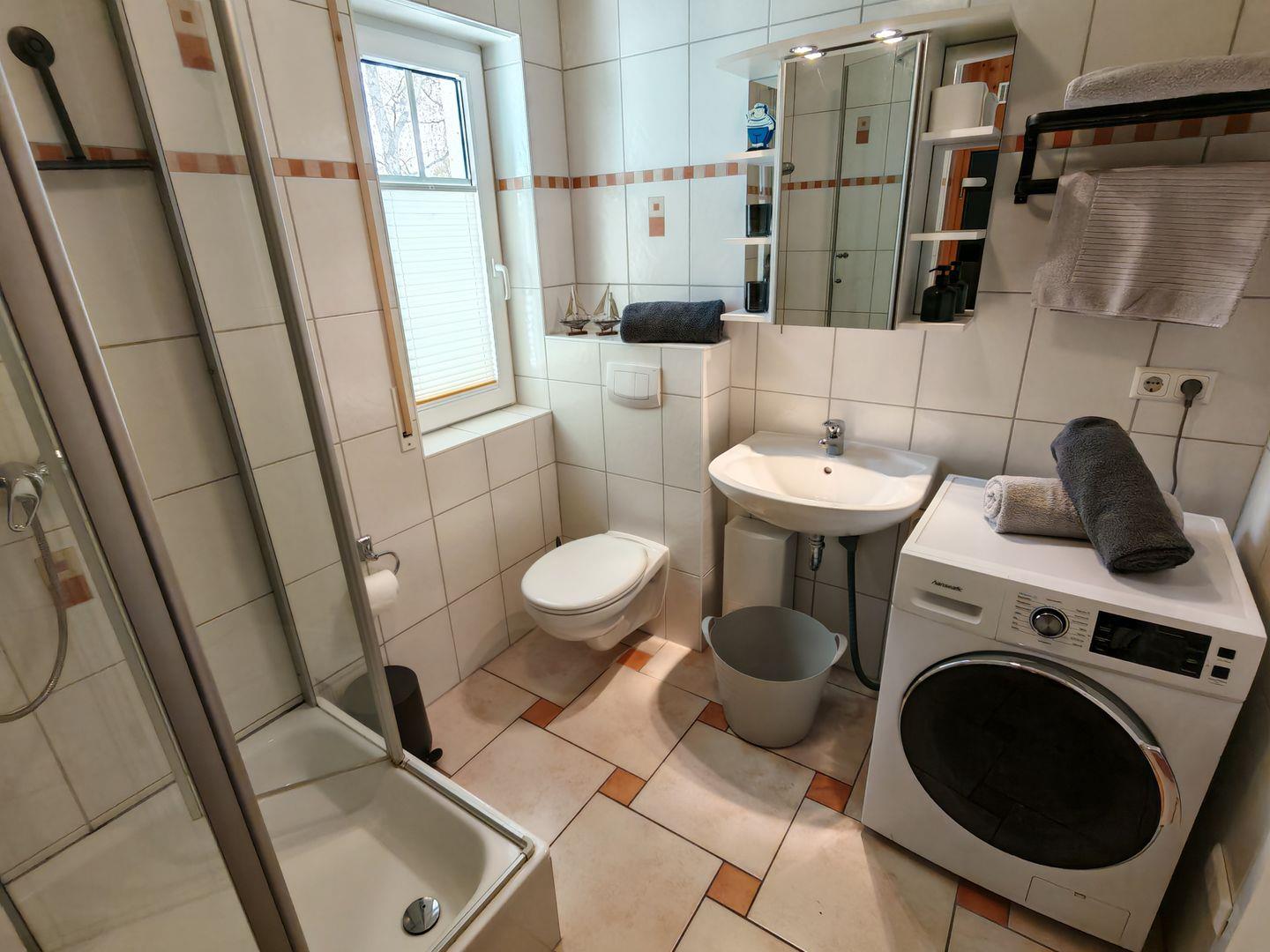 Zwei moderne Duschbäder mit Tageslicht sorgen für Frische und Komfort. Zusätzlich steht Ihnen eine Waschmaschine zur Verfügung, um auch während Ihres Aufenthalts den gewohnten Komfort zu genießen.