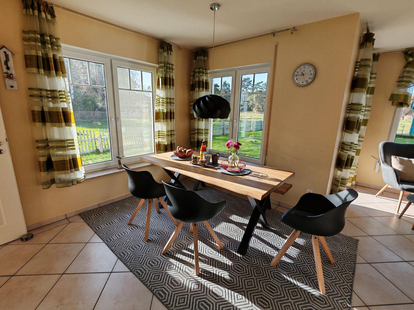 Eine Südostterrasse erweitert den Wohnraum nach draußen. Hier können Sie unter freiem Himmel entspannen und den Ausblick auf die grüne Umgebung genießen. Die Terrasse ist mit bequemen Möbeln ausgestattet und bietet den idealen Rahmen für gesellige Stunden im Freien.