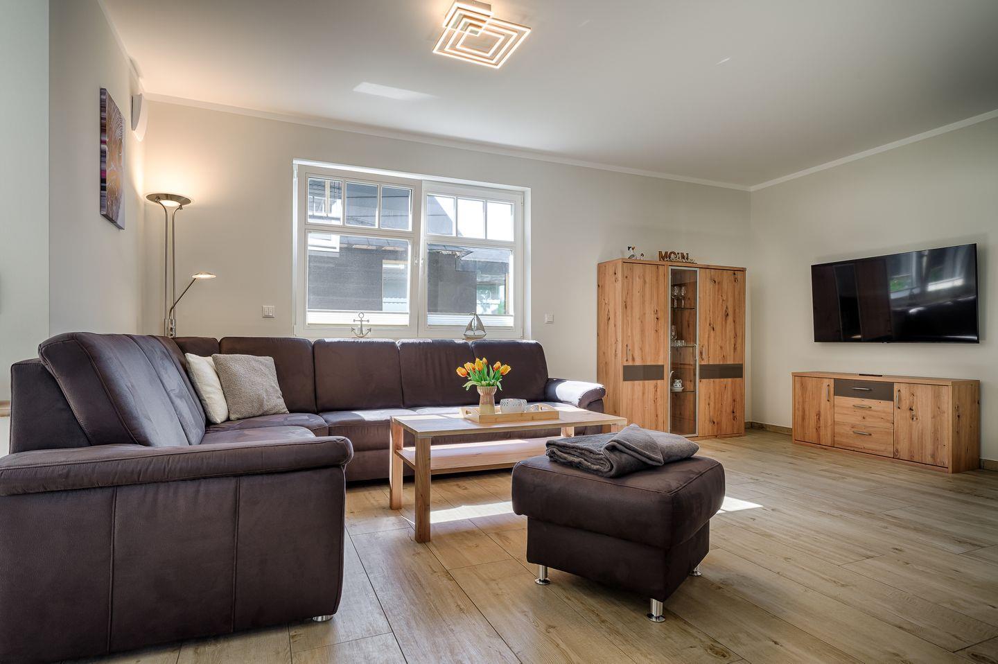 Wohnbereich mit Couchgarnitur, Vitrine, TV