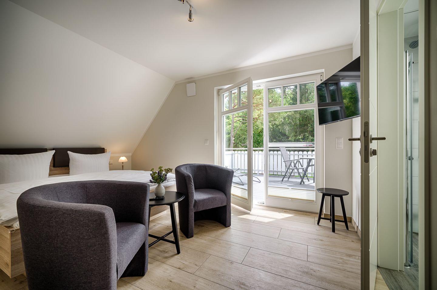 1 Schlafzimmer mit Doppelbett (1,80 x 2,00 m) und Zugang zur Dachterrasse, TV, 2 Sessel, raumanliegend eigenes Badezimmer mit DU/WC