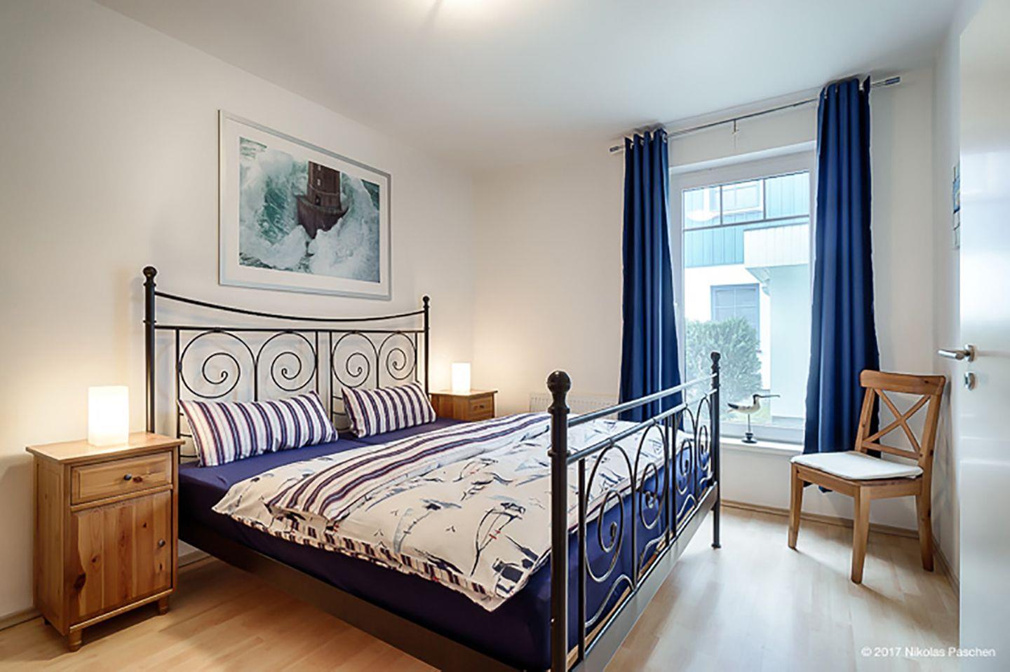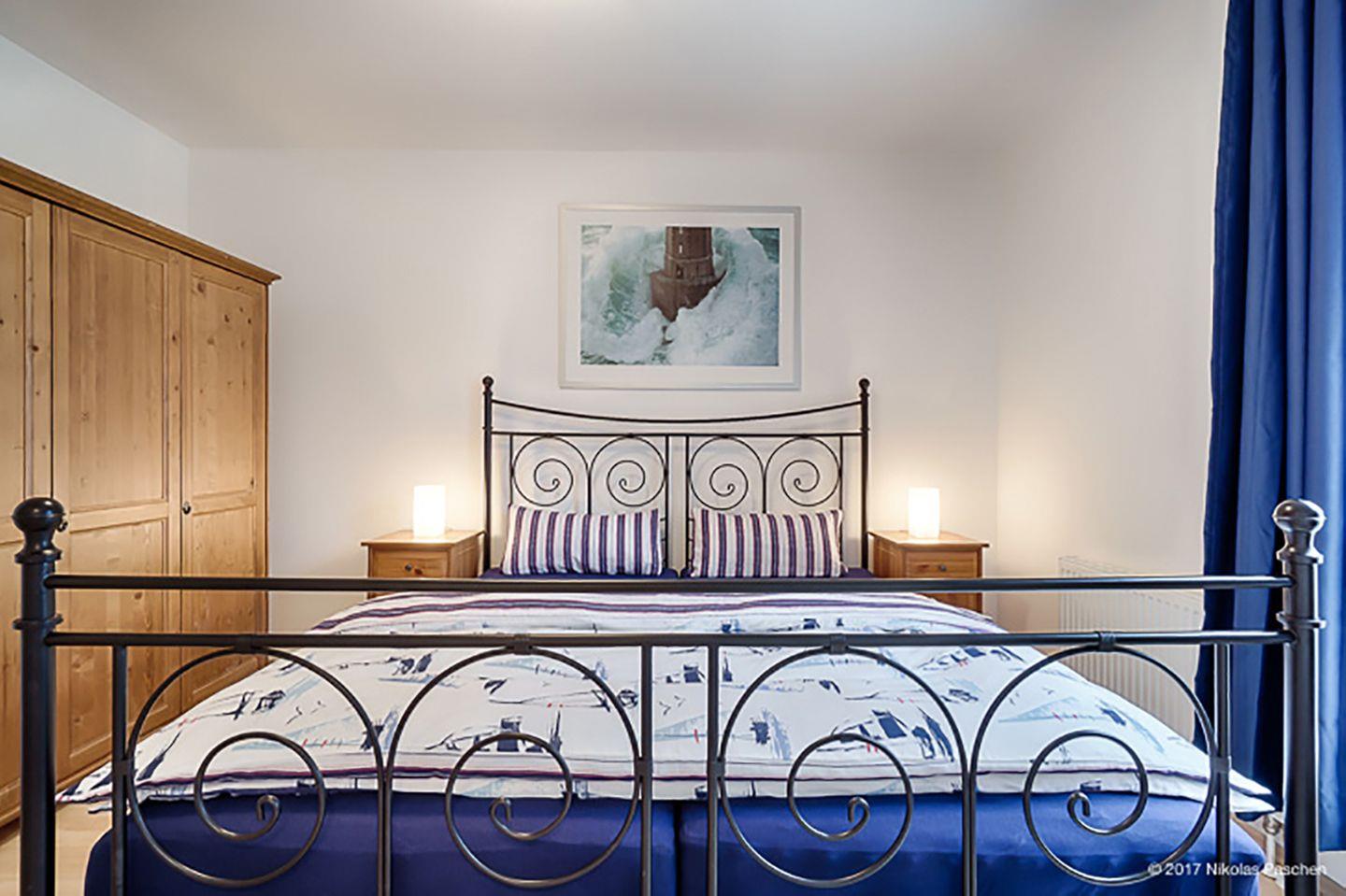 Das Schlafzimmer ist mit einem Doppelbett (180 x 200 cm) eingerichtet, und auf Wunsch können ein Reisebett (ohne Bettzeug) sowie ein Hochstuhl bereitgestellt werden. Fliegenschutzgitter sorgen für zusätzlichen Komfort.